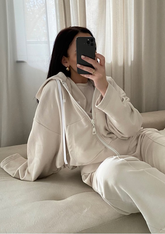 Modna bluza damska oversize. Funkcjonalnie zapinana zamkiem, wyposażona w kaptur z troczkami i kieszenie. Model w kokosowym odcieniu.