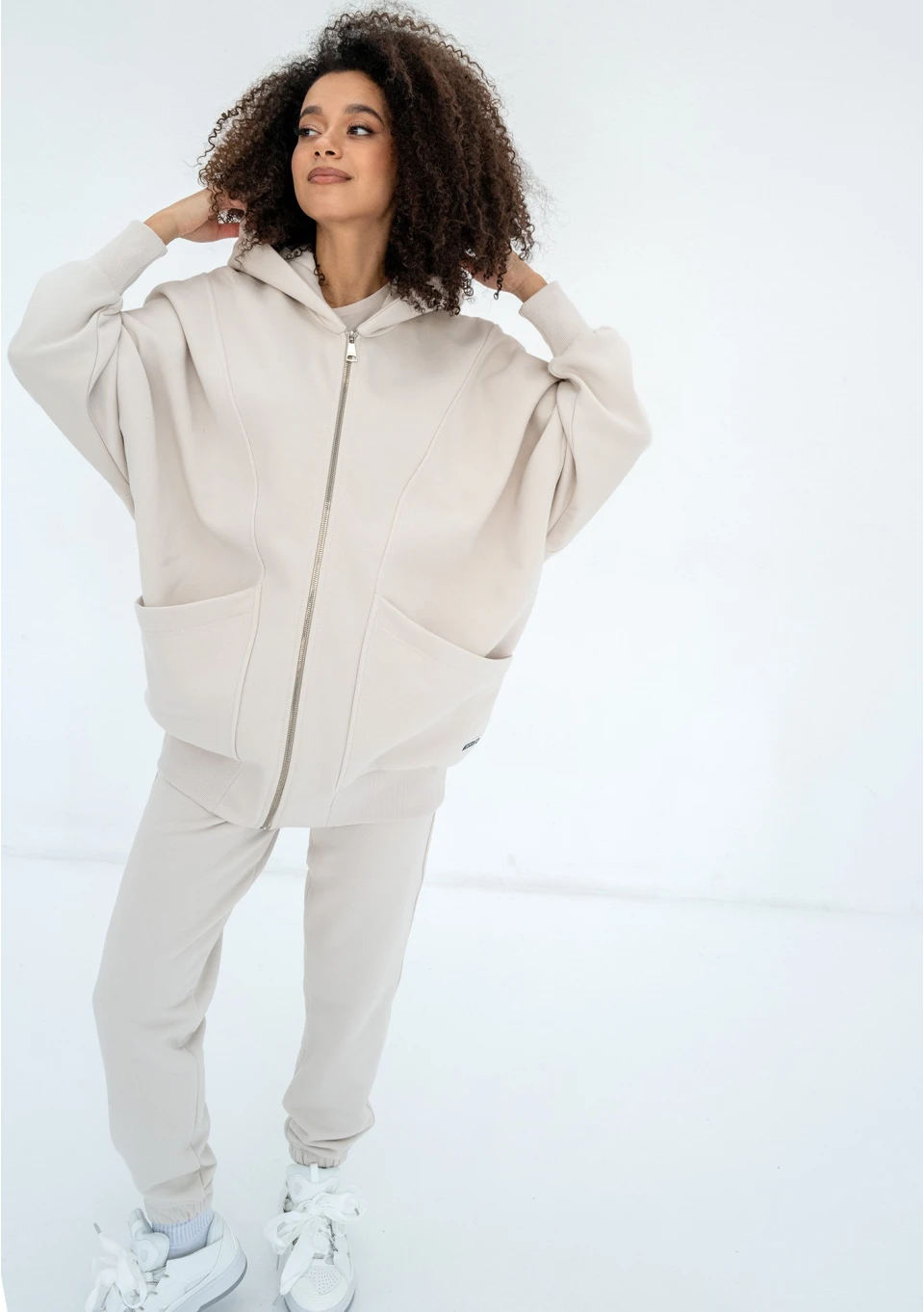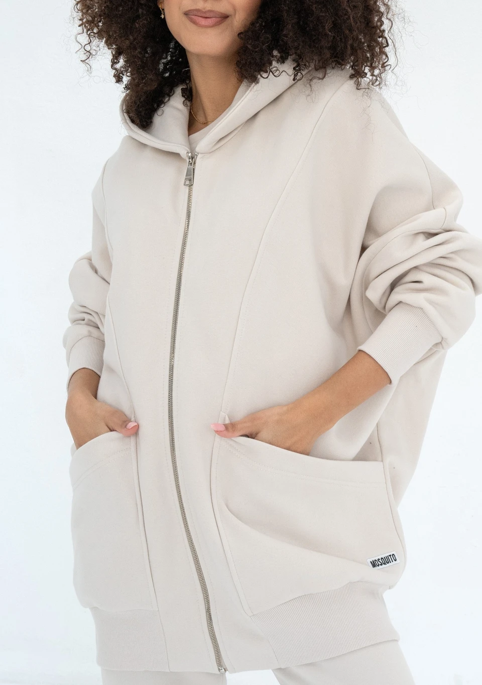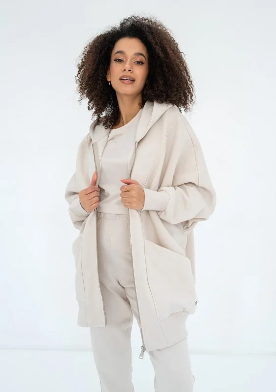 Fason oversize, zapinany, z kapturem, dużymi kieszeniami i ściągaczami.
