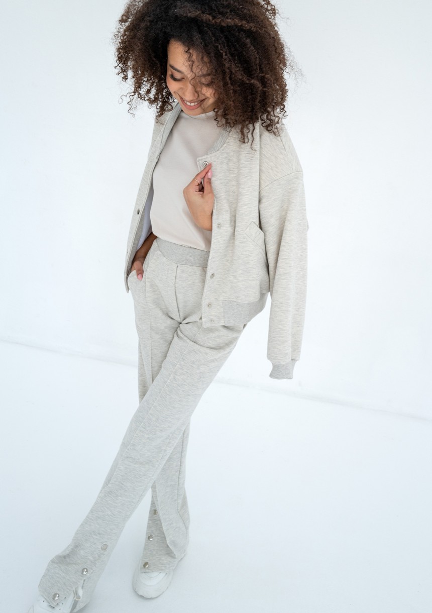 Damska bluza bomberka to wyjątkowy i charakterystyczny fason, który wyróżni się w Twojej szafie. Doda on odrobinę stylu do Twoich codziennych zestawów! Wybierz model zakończony elastycznymi ściągaczami i wygodnym zapięciem na metalowe napy. Jest niezwykle praktyczna i uniwersalna. Wykonaliśmy ją z materiału w kolorze Warm Melange - to ciepły odcień melanżowy, inny niż Grey Melange, w którym proponujemy większość naszych dresowych fasonów.