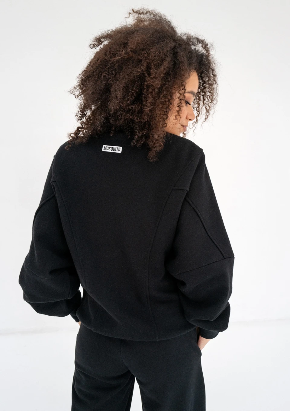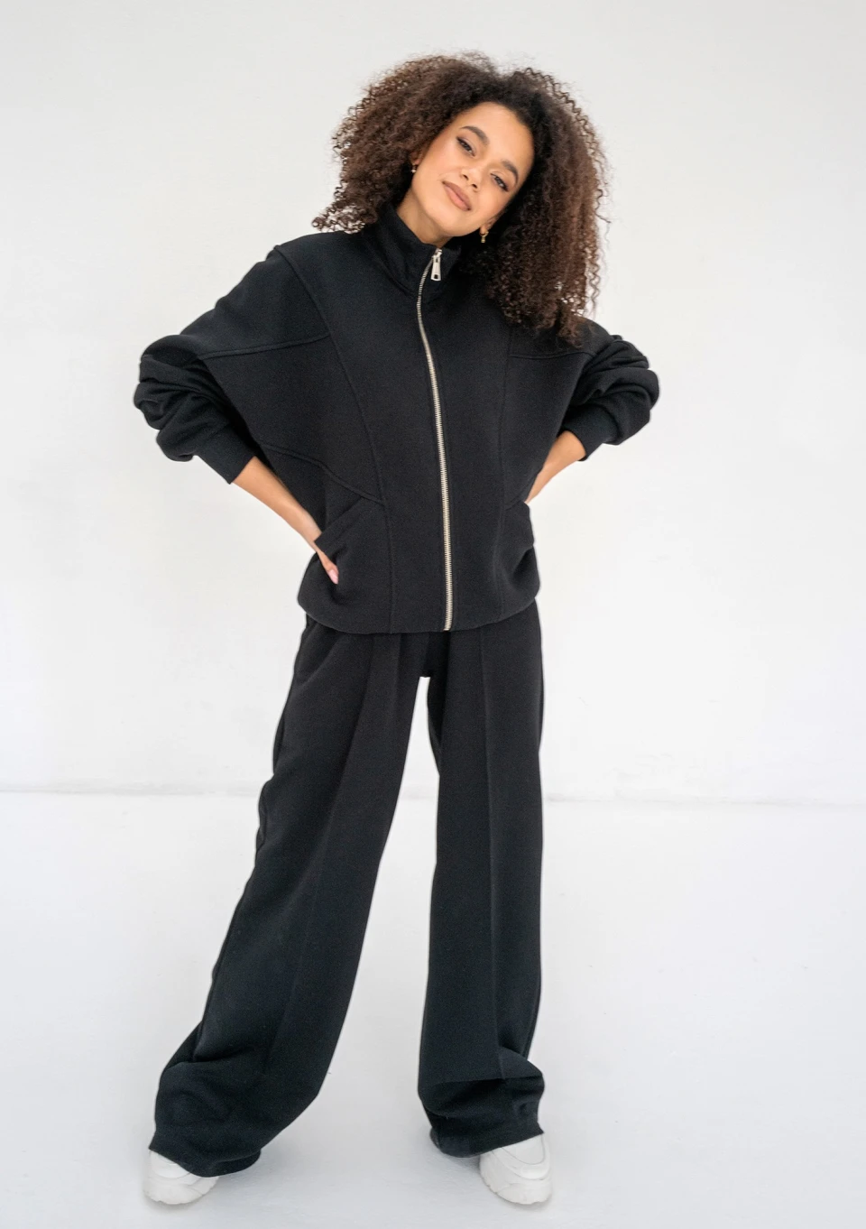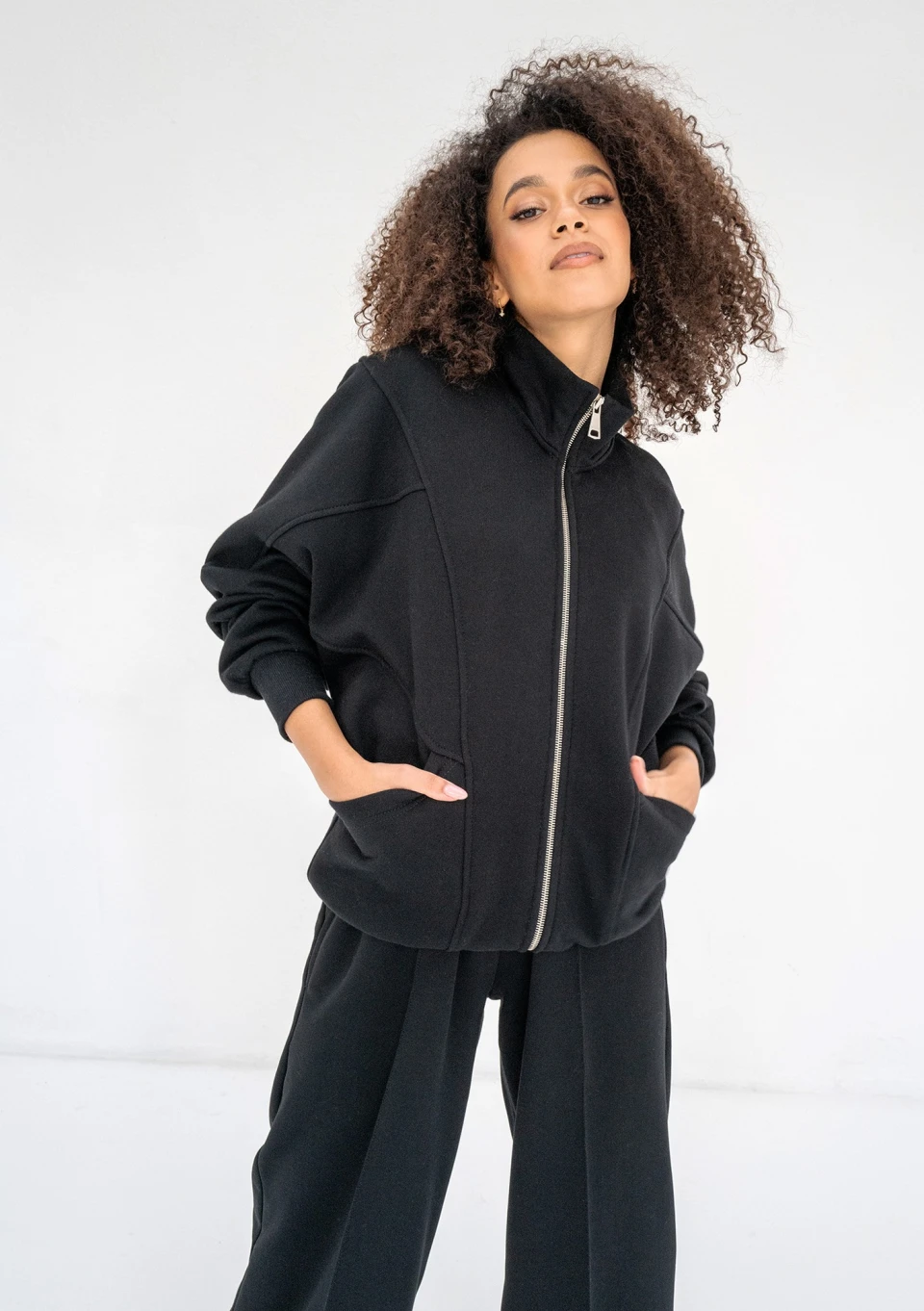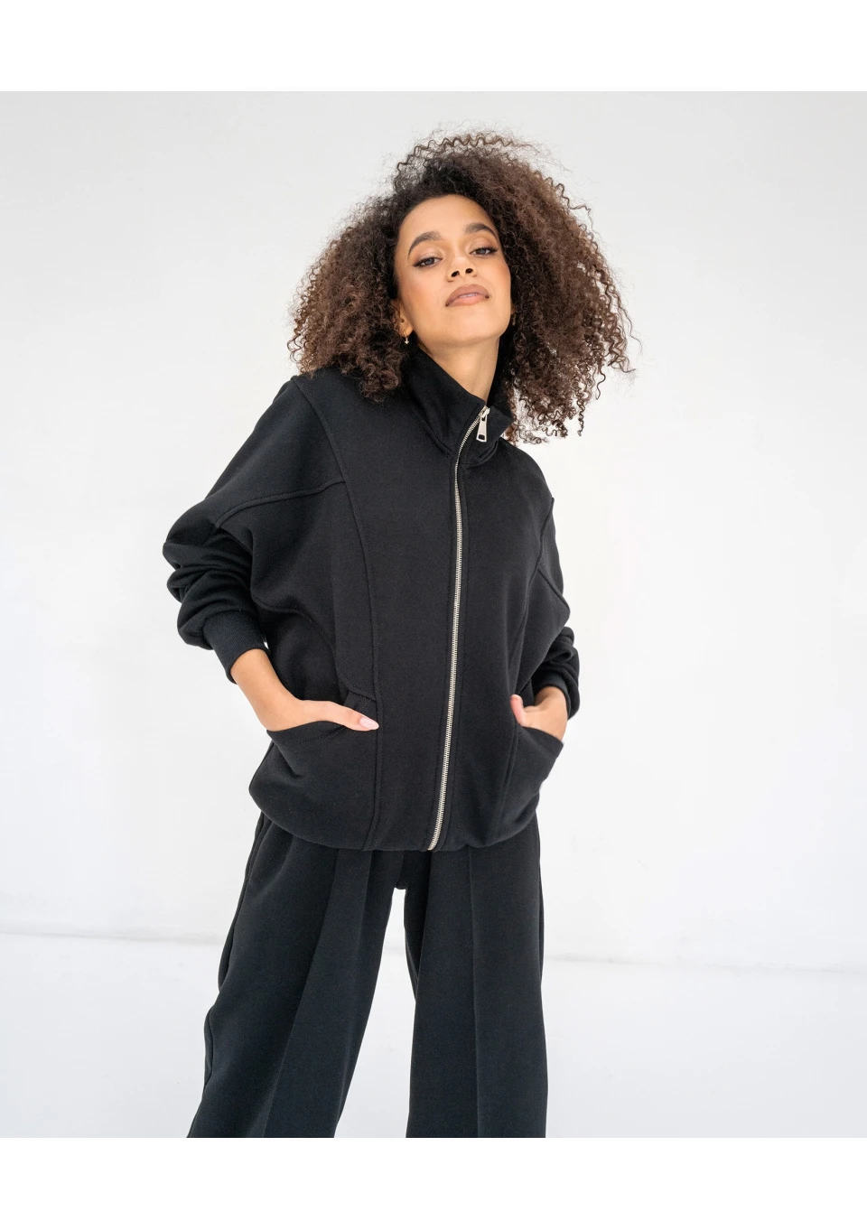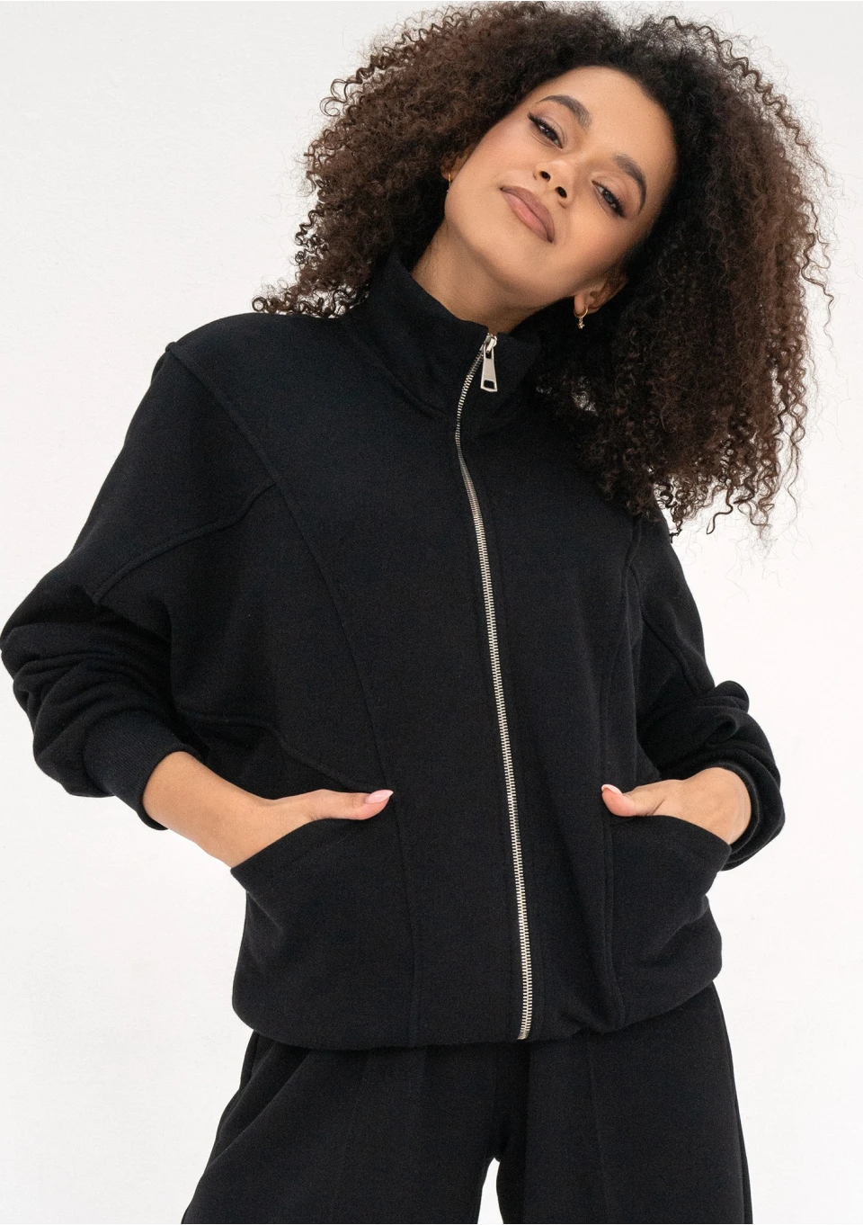 Czarna bluza damska o modnym kroju oversize. Super wygodna dzięki rozpinanej formie. Model ze stójką, dużymi kieszeniami i nietuzinkowym układem szwów.
