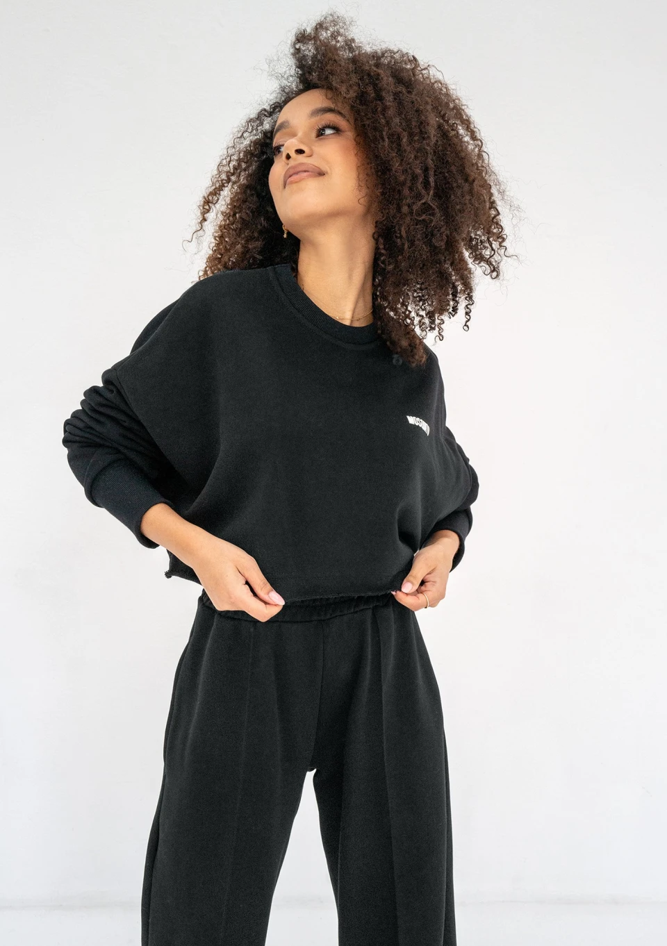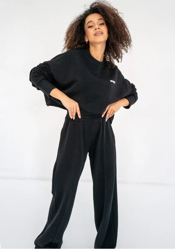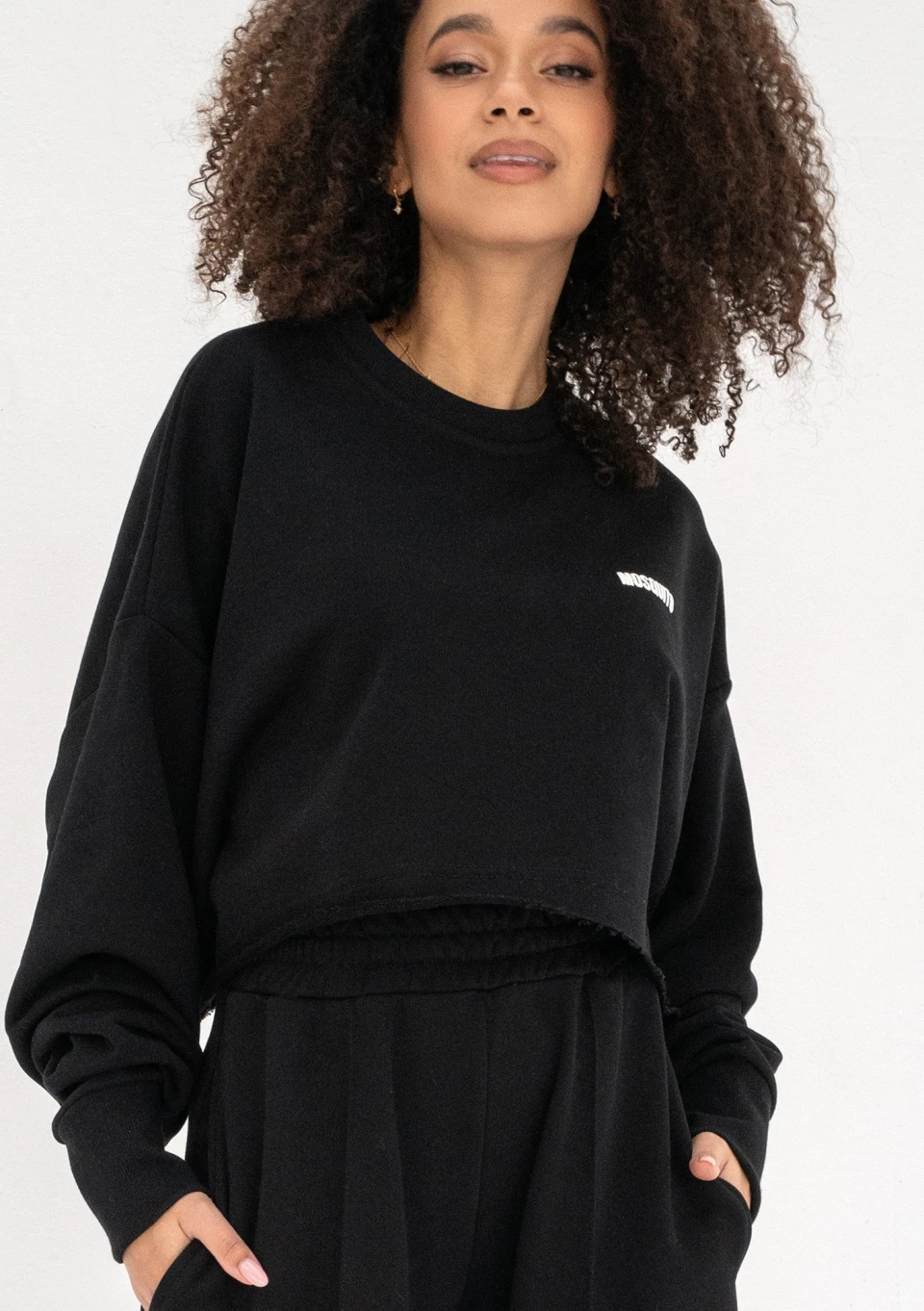 Luźna bluza damska crop na wiosnę i lato, wykonana z dzianiny pętelkowej w czarnym kolorze. Design oversize, podkreślony białym logiem.