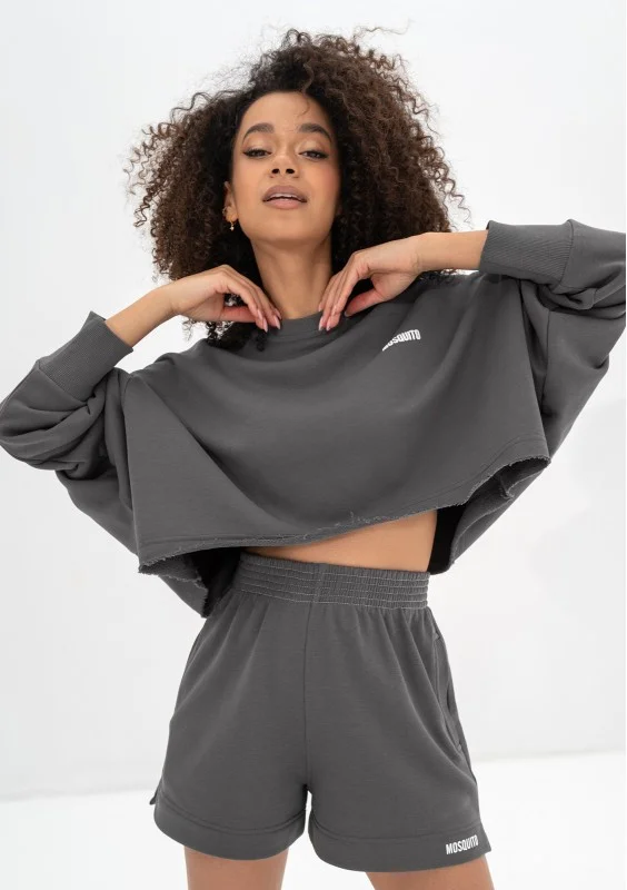 Krótka, grafitowa bluza damska crop z miękkiej dzianiny bawełnianej. Model o szerokim i swobodnie luźnym kroju oversize.