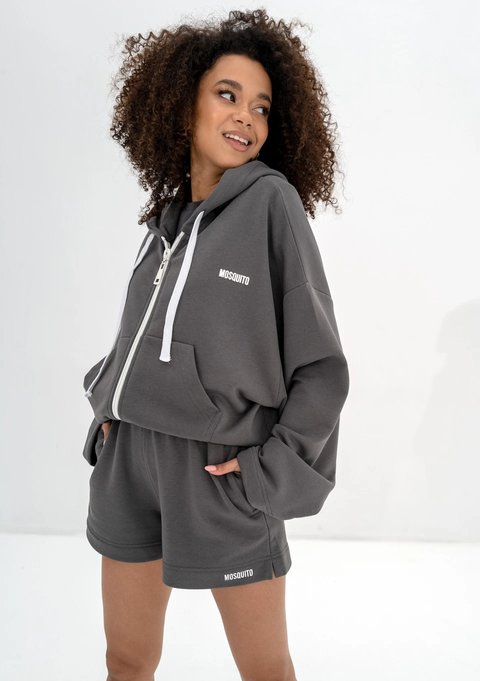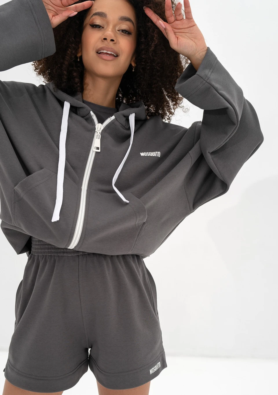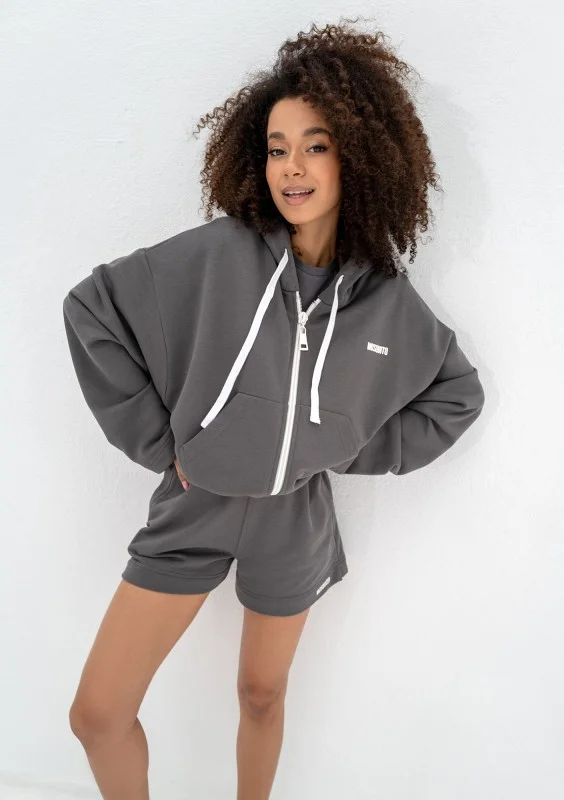 Bluza damska w odcieniu grafitu o nowoczesnym kroju oversize. Praktycznie zapinana na zamek błyskawiczny, wyposażona w kaptur z troczkami oraz praktyczne kieszenie.