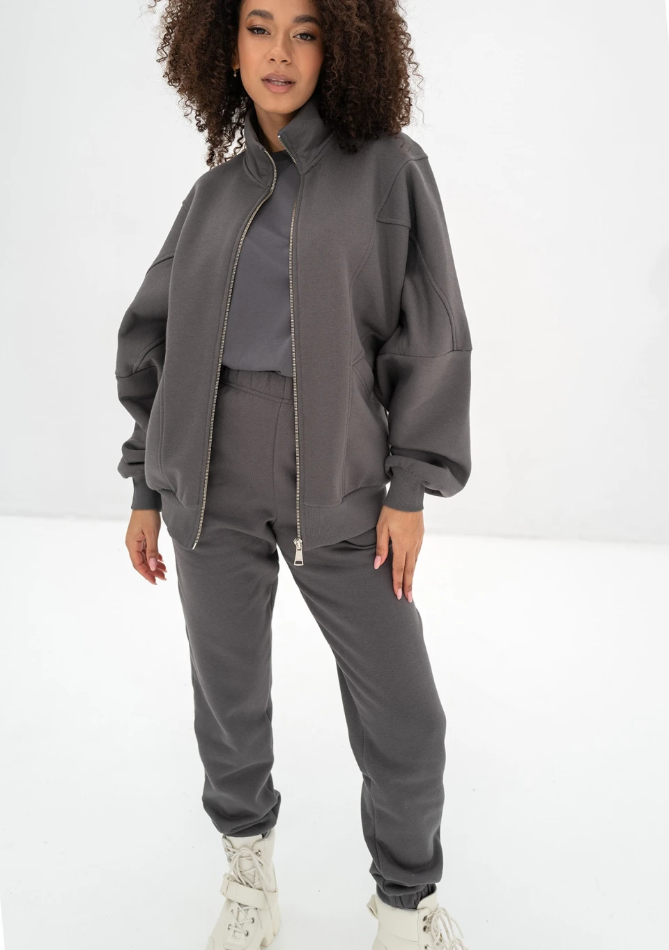 Modna bluza damska w przestronnym fasonie oversize oferuje niezrównany komfort dzięki swojej rozpinanej konstrukcji. To model ze stójką.