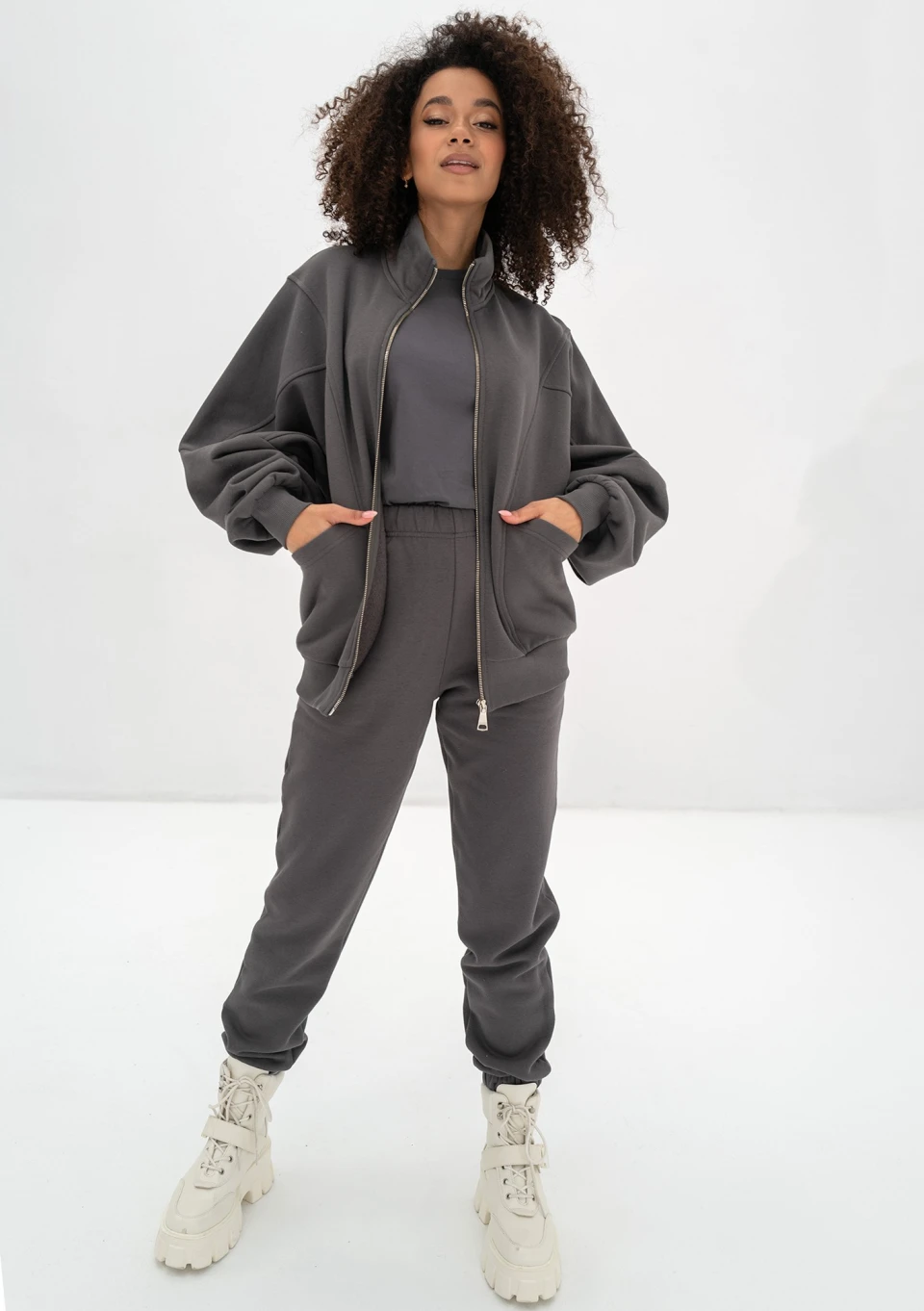 Fason oversize, zapinany, ze stójką, kieszeniami i ściągaczami.