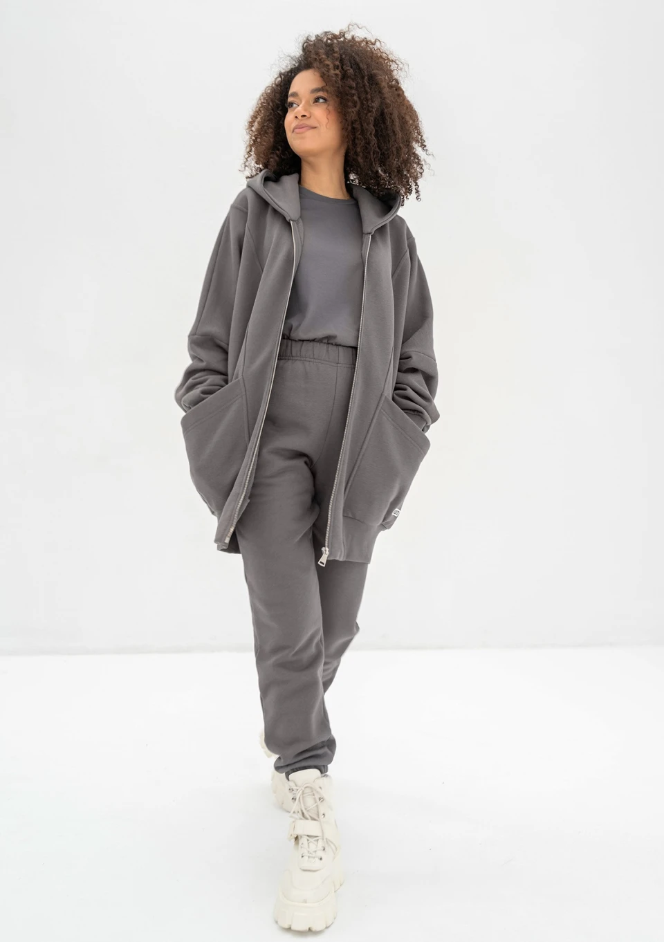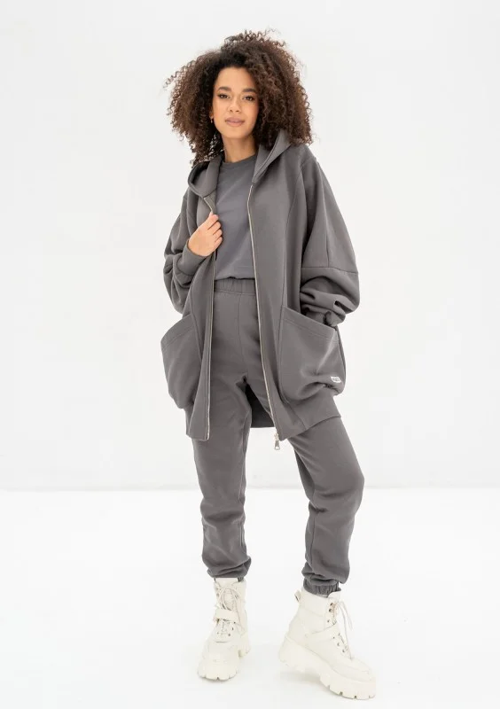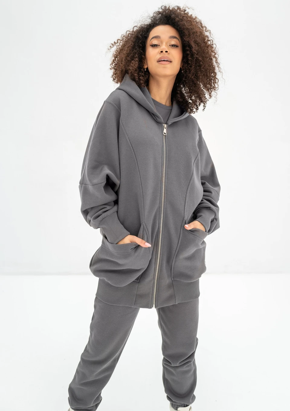 Fason oversize, zapinany, z kapturem, dużymi kieszeniami i ściągaczami.