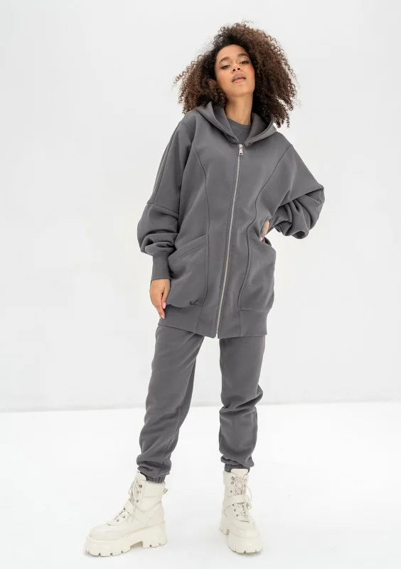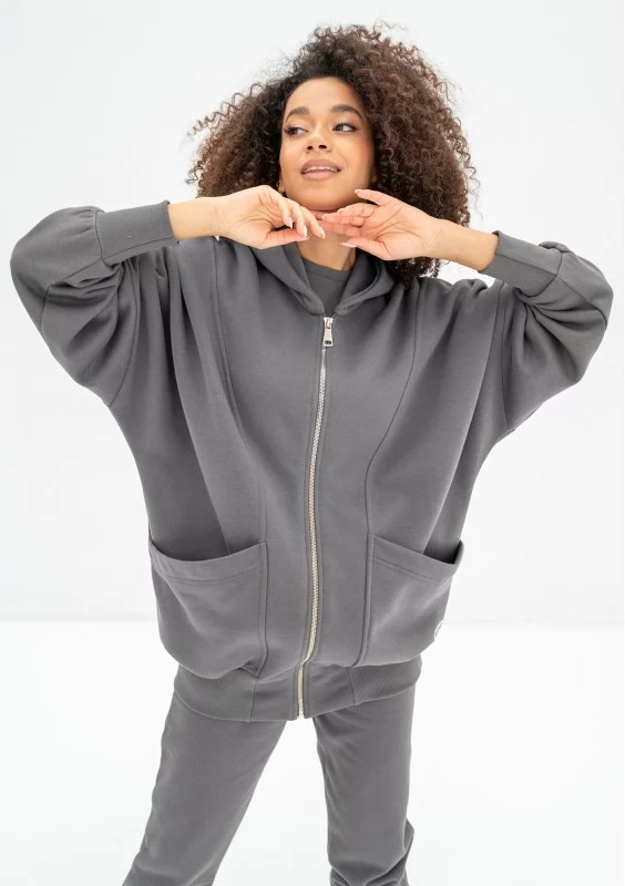 Wszechstronna bluza damska o modnym kroju oversize. Funkcjonalność fasonu wyznaczają pojemne kieszenie, kaptur i zapięcie.