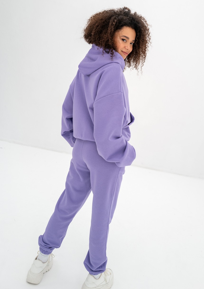 Bluza damska w fioletowym kolorze o nowoczesnym kroju oversize. Praktycznie zapinana na zamek błyskawiczny, wyposażona w kaptur z troczkami oraz praktyczne kieszenie.
