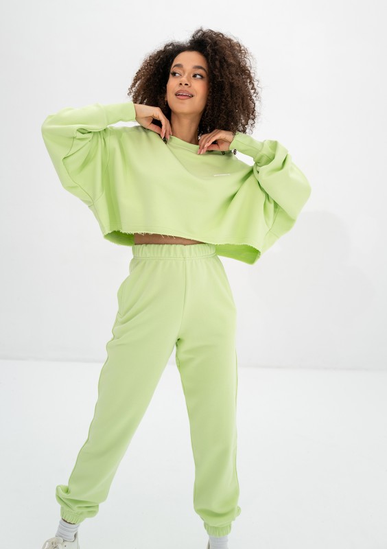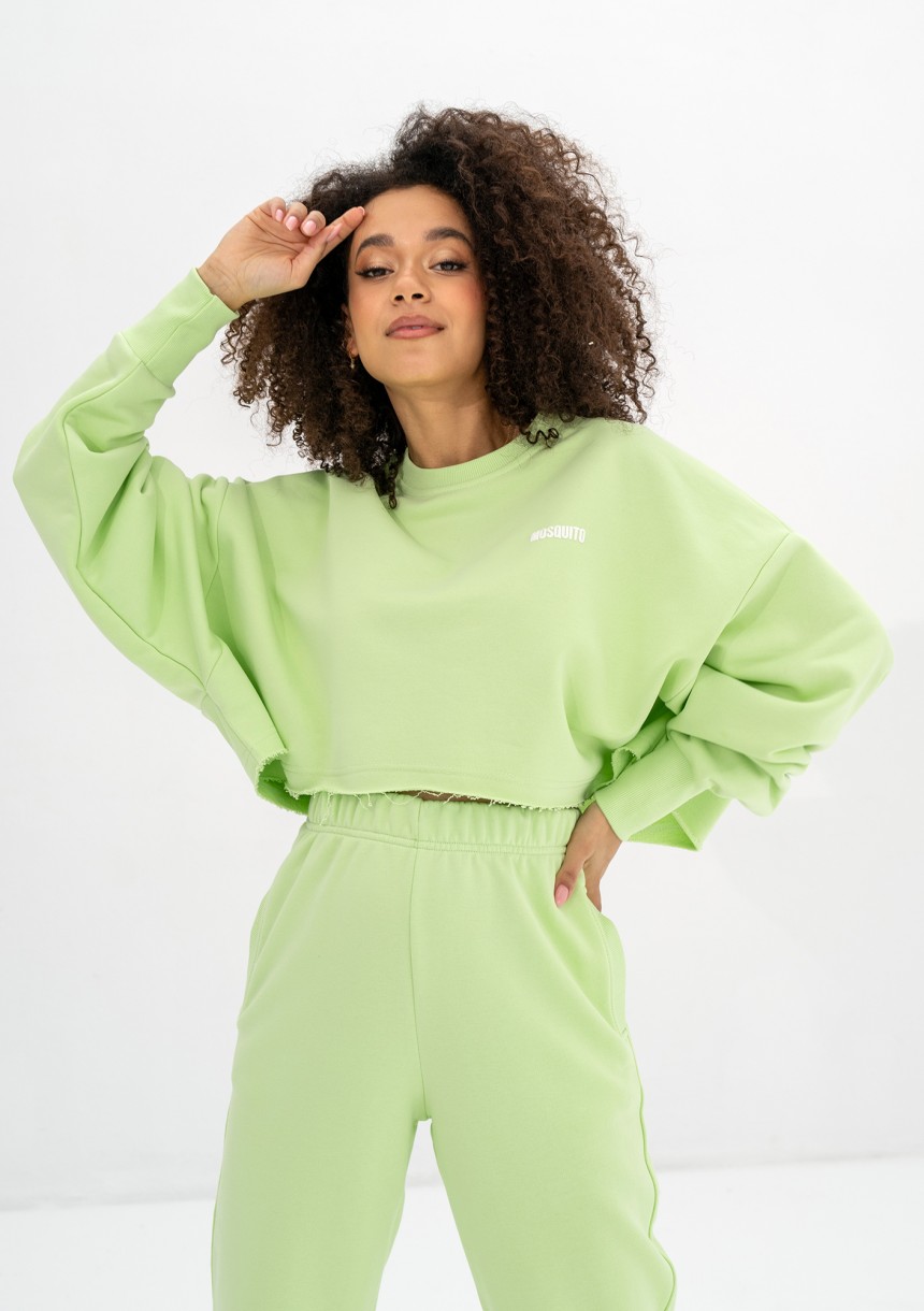 Limonkowa bluza damska o krótkim i szerokim kroju crop, wykonana z bawełnianej dzianiny pętelkowej. Design oversize, podkreślony białym logiem.