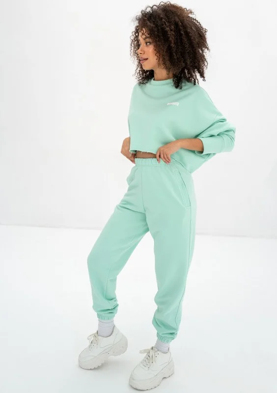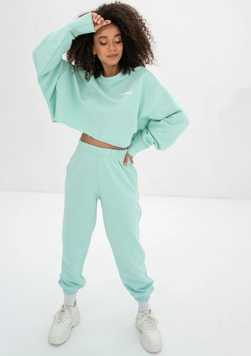 Miętowa bluza damska o krótkim i szerokim kroju crop, wykonana z bawełnianej dzianiny pętelkowej. Design oversize, podkreślony białym logiem.