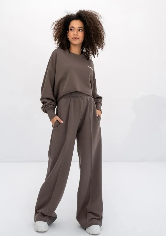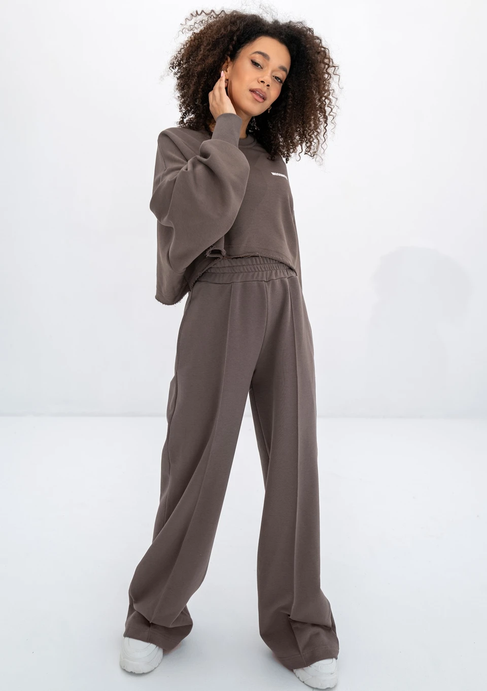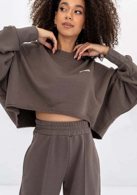 Brązowa bluza damska o krótkim i szerokim kroju crop, uszyta z bawełnianej dzianiny pętelkowej. Design oversize, podkreślony logiem.
