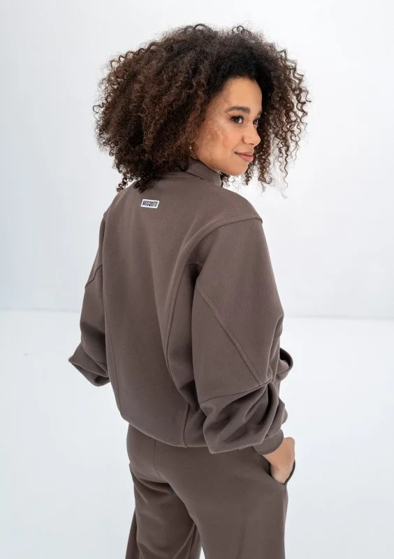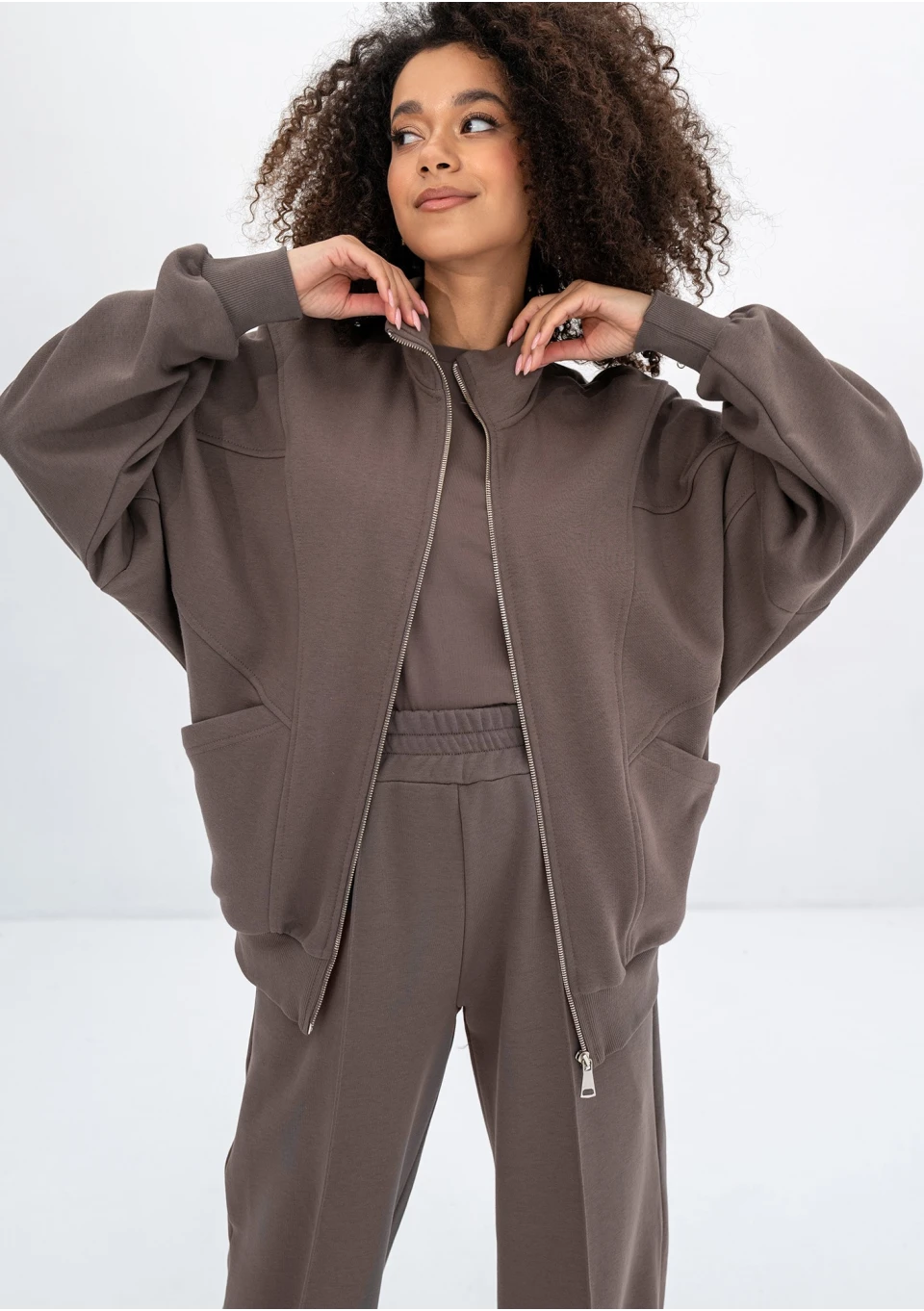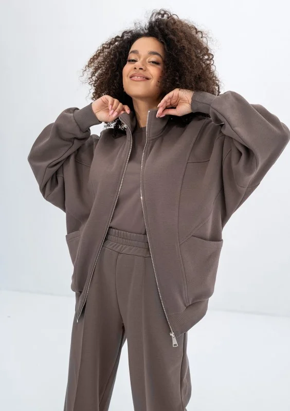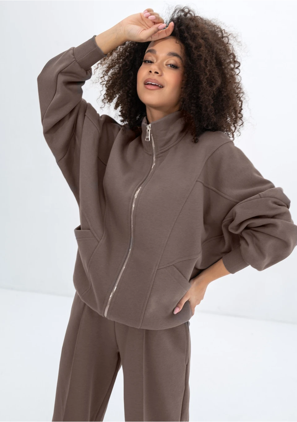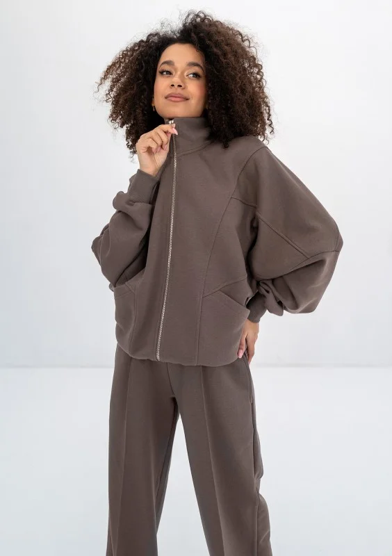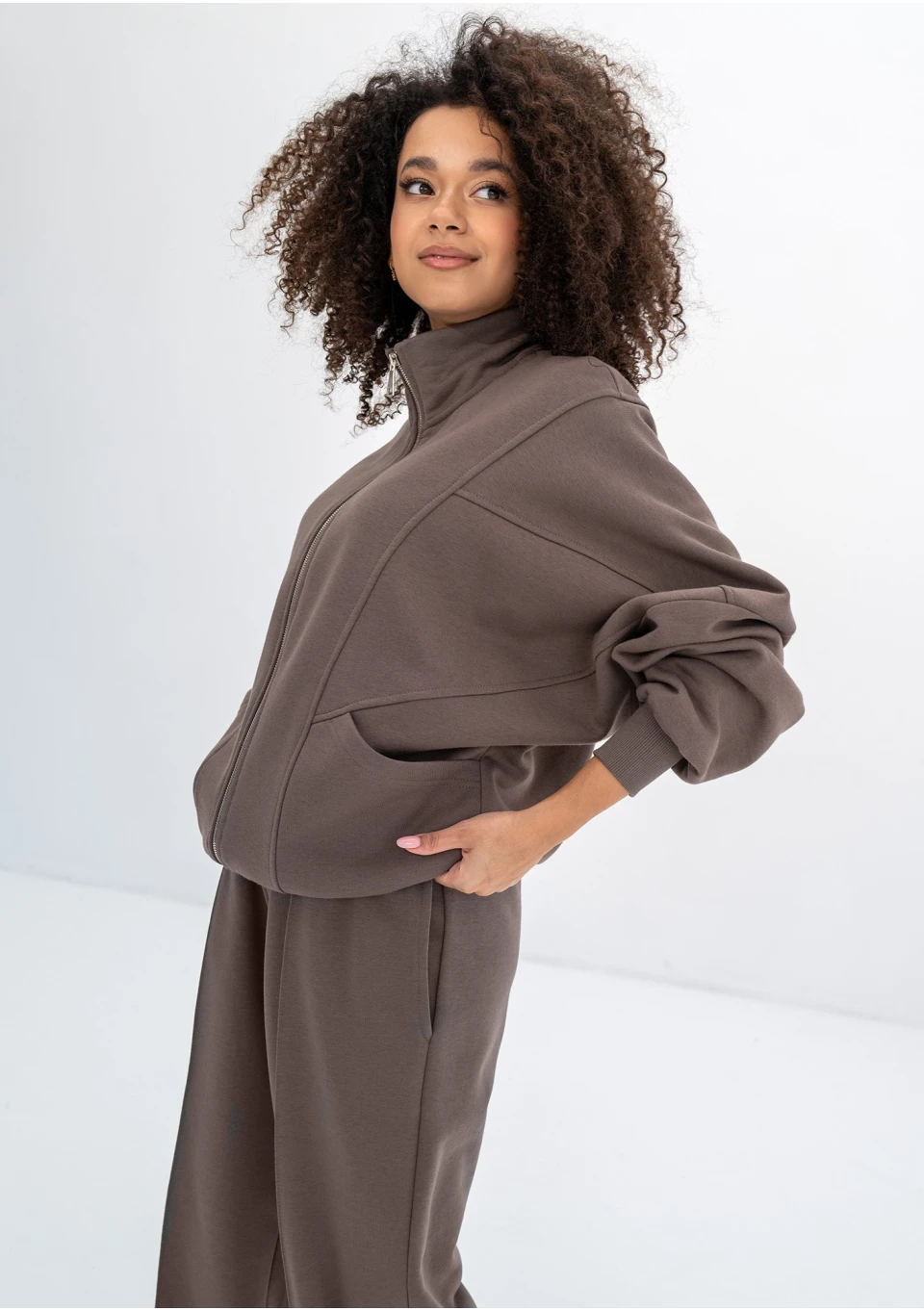 Brązowa bluza dresowa o stylowym i wygodnym kroju oversize. Idealna na zmienną pogodę dzięki rozpinanej formie. Model ze stójką i dużymi kieszeniami.