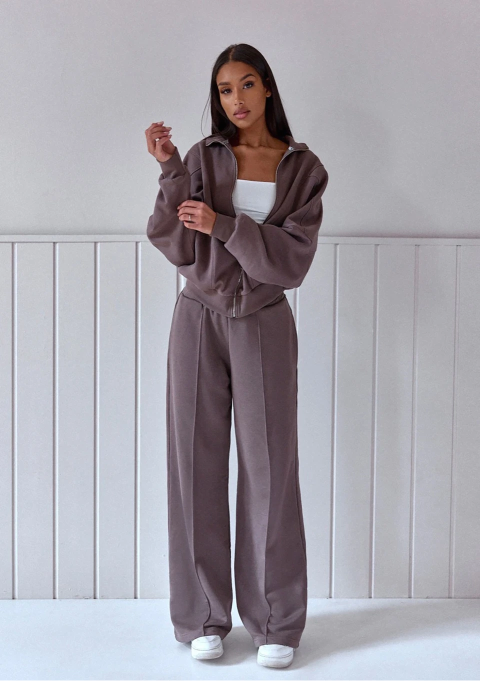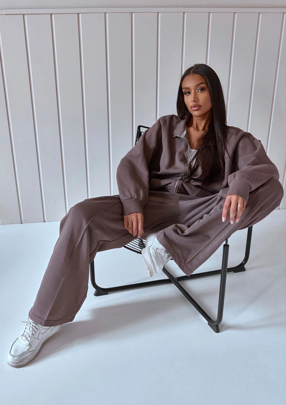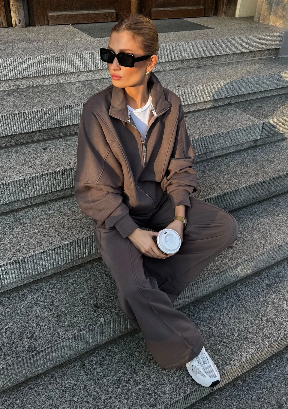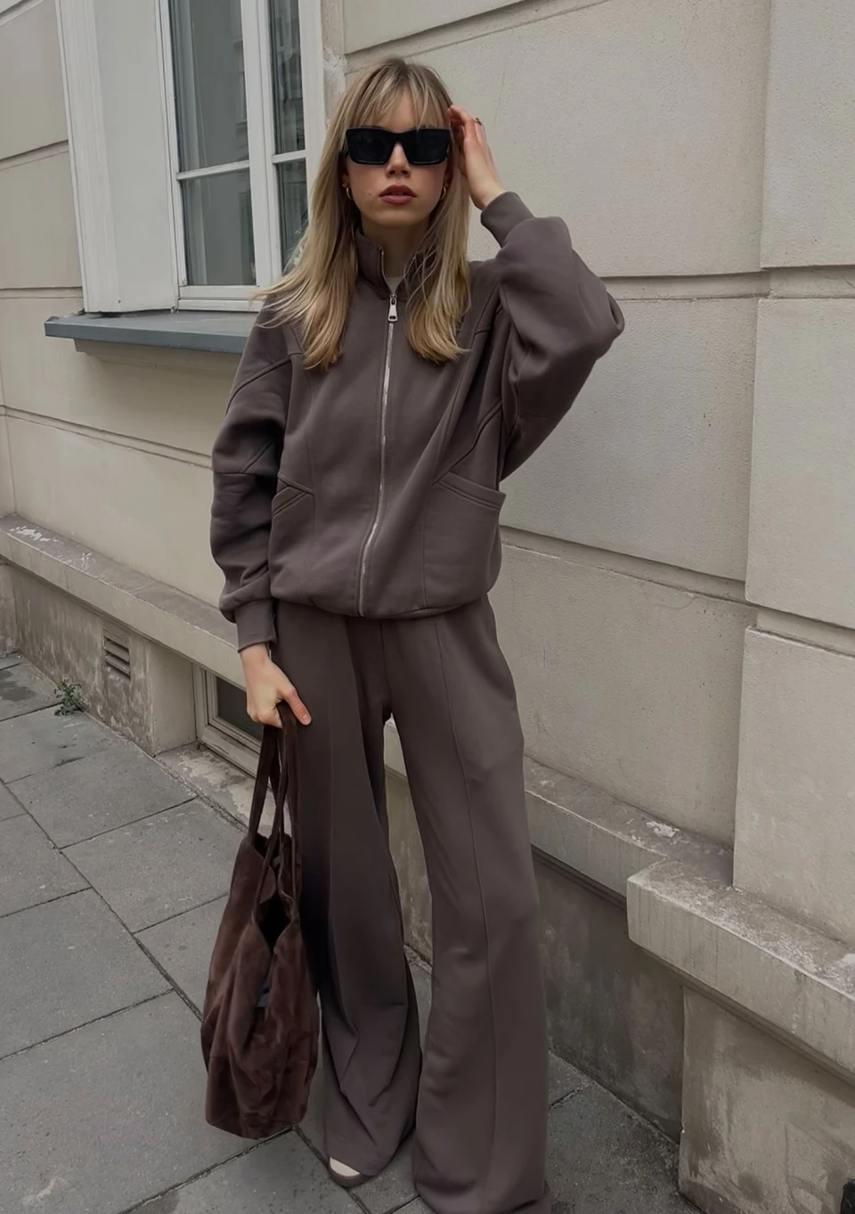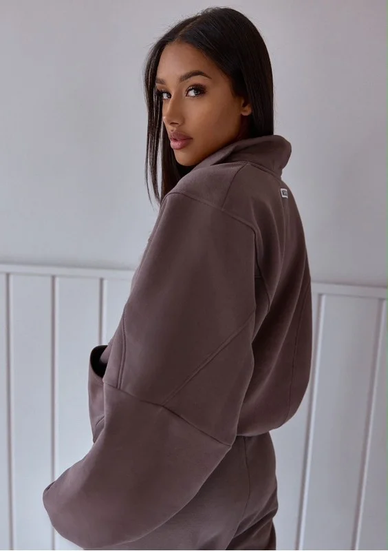 Brązowa bluza dresowa o stylowym i wygodnym kroju oversize. Idealna na zmienną pogodę dzięki rozpinanej formie. Model ze stójką i dużymi kieszeniami.