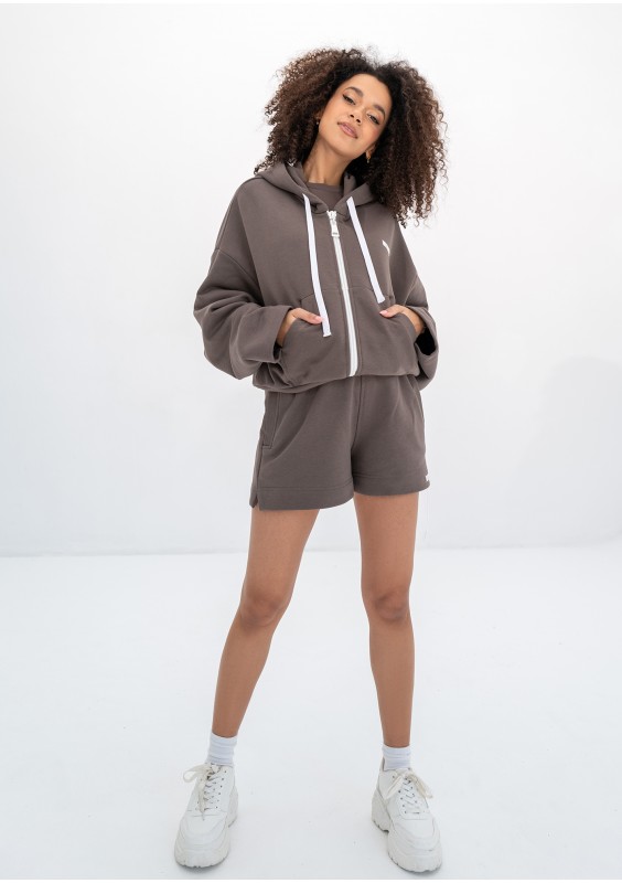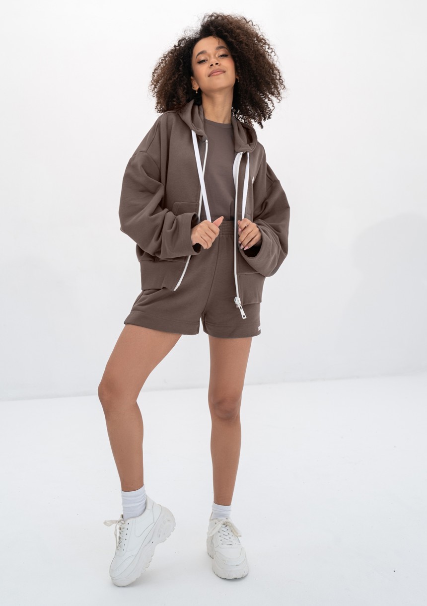 Brązowa bluza o modnym, luźnym kroju oversize. Praktycznie zapinana na zamek, posiada kaptur z regulowanymi troczkami oraz kieszenie, co czyni ją zarówno stylową, jak i funkcjonalną.