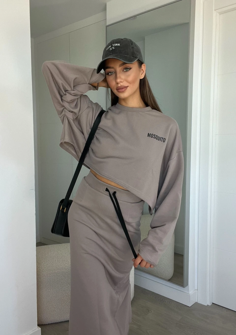 Super luźna bluza damska dresowa swobodnie wykończona bez ściągaczy. Uszyta z miękkiej dzianiny pętelki w delikatnym kolorze taupe.