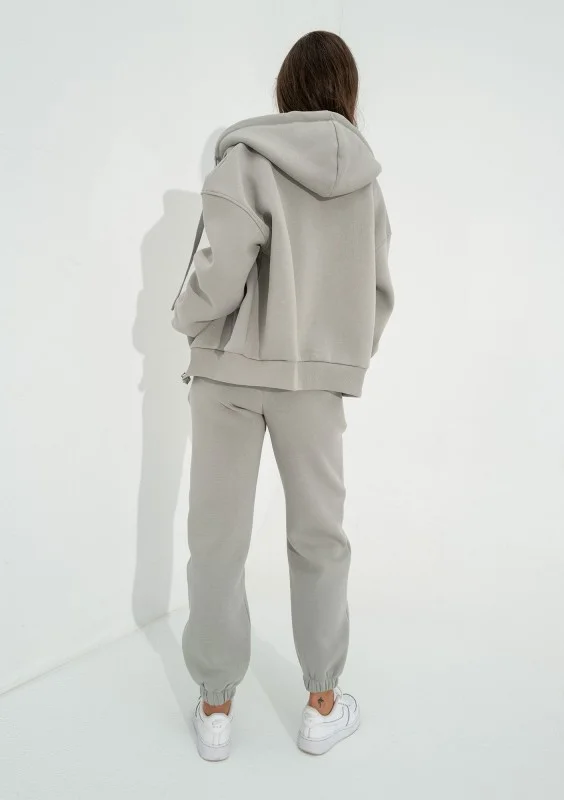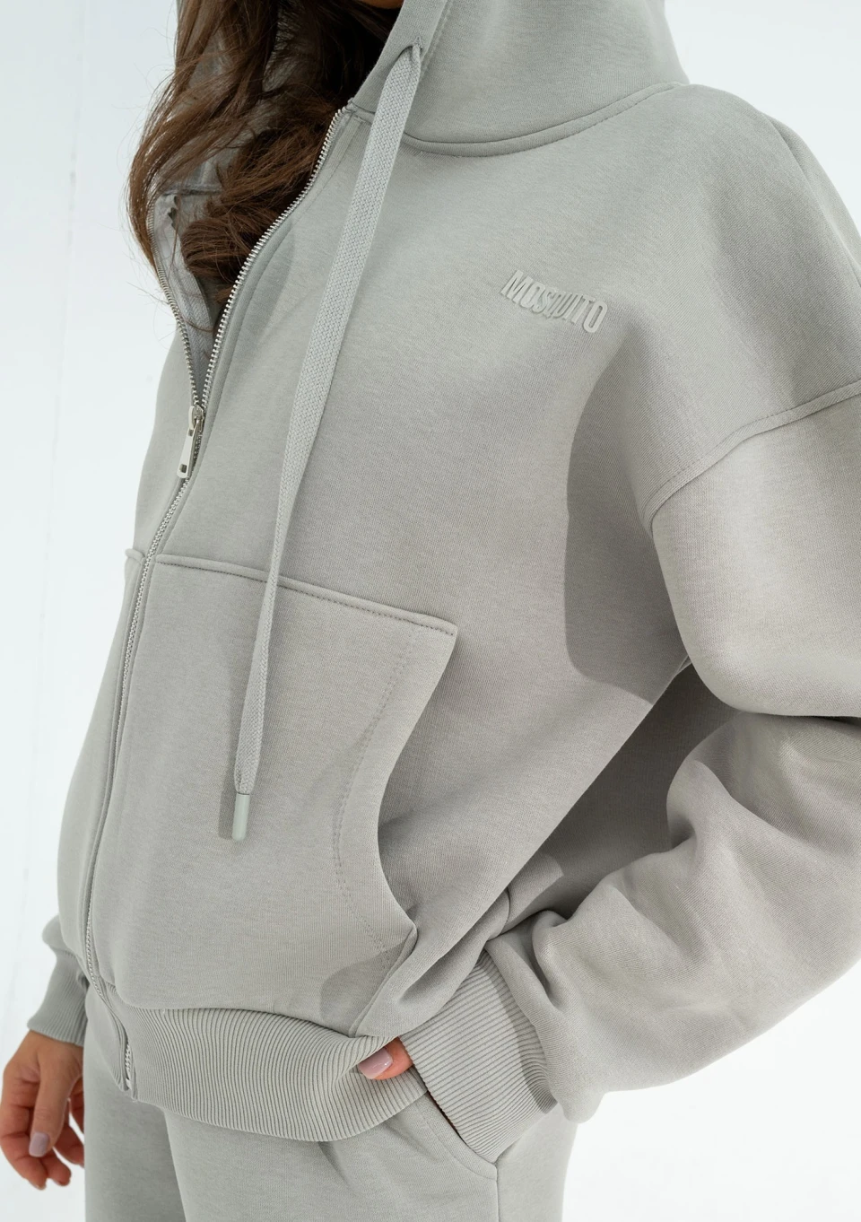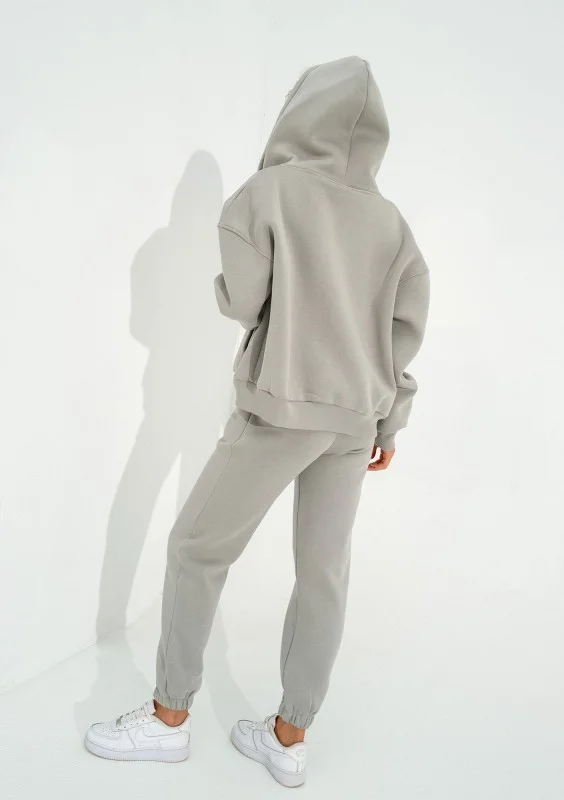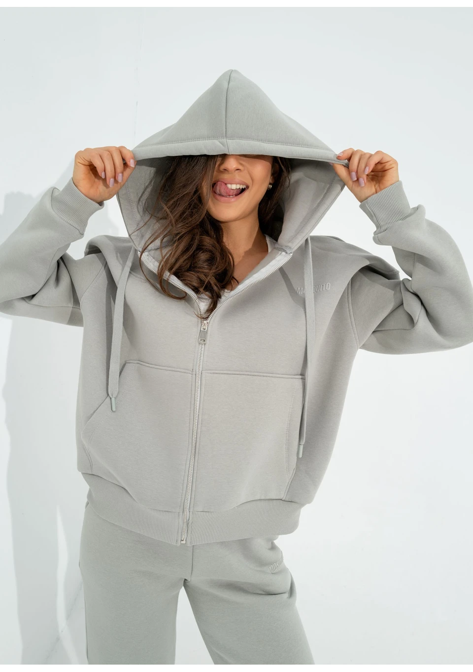 Klasyczna, rozpinana bluza damska dresowa z kieszeniami. Wyposażona w funkcjonalny kaptur z troczkami. Model w szarym kolorze, dopełniony spójnym logiem.