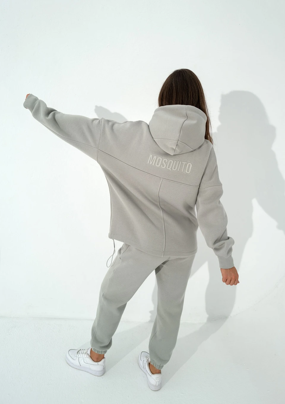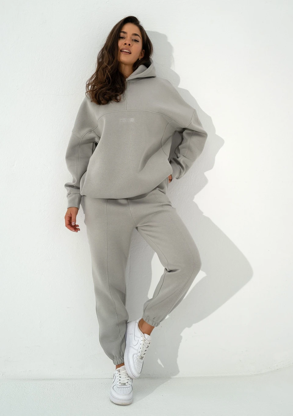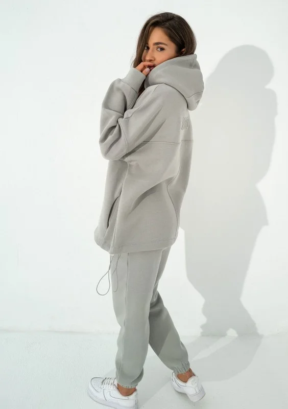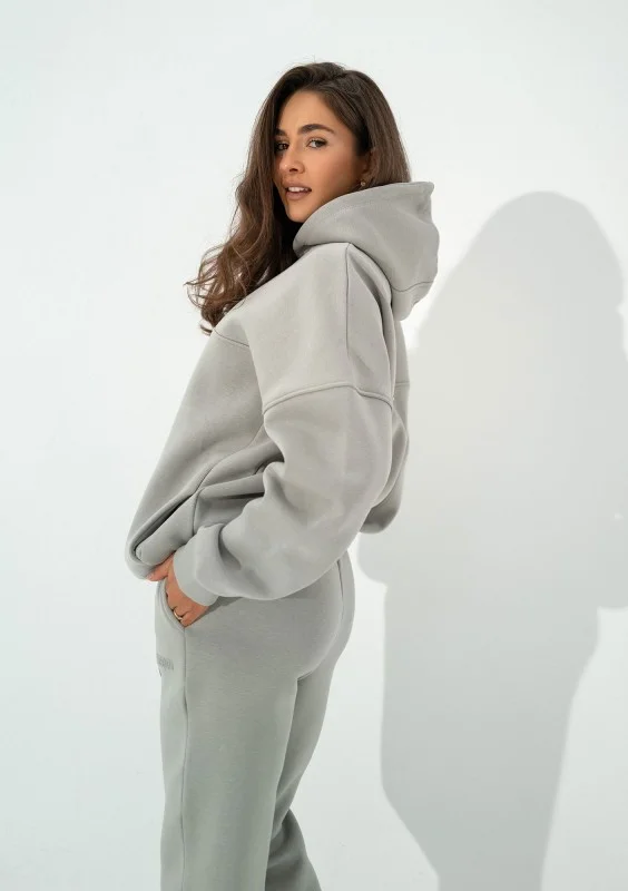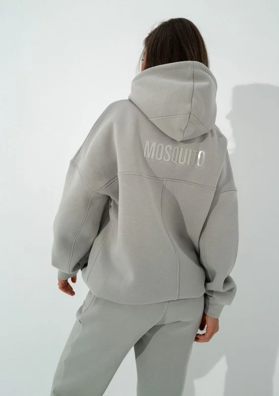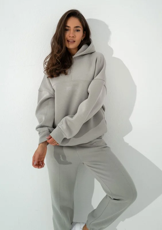 Szara bluza kangurka o kroju oversize. Układ szwów nadaje jej wyjątkowego charakteru, a kieszenie, kaptur i dolny troczek zapewniają pełną funkcjonalność.