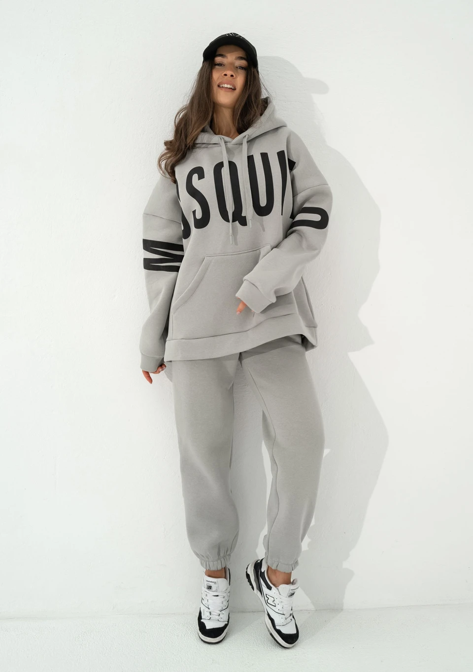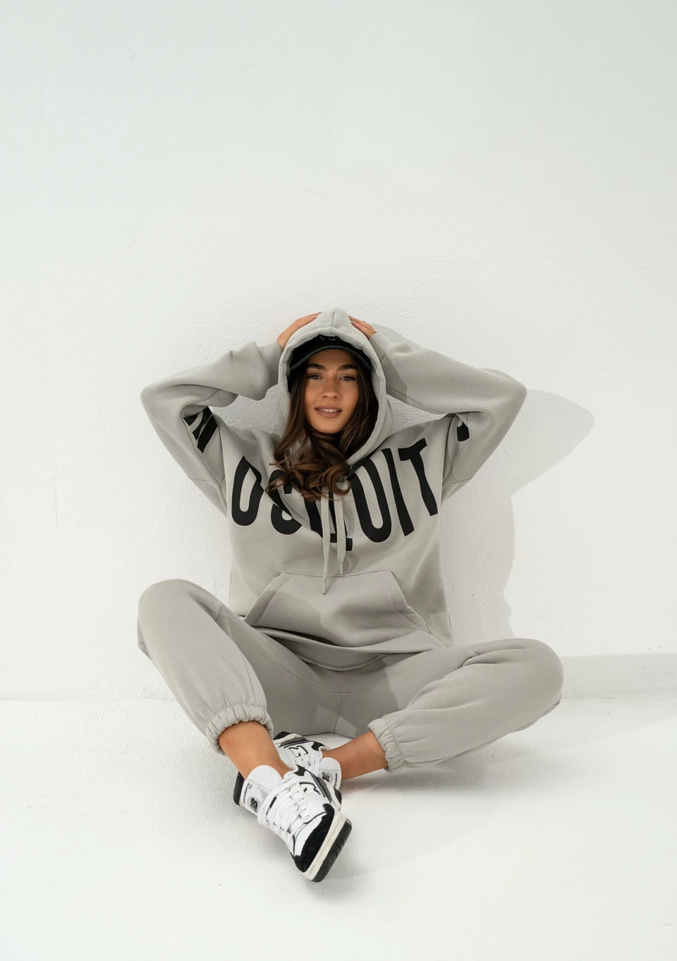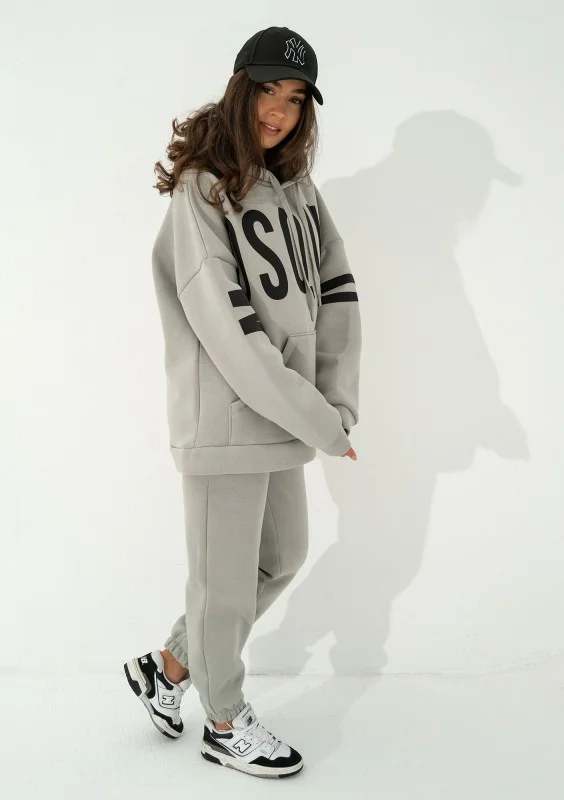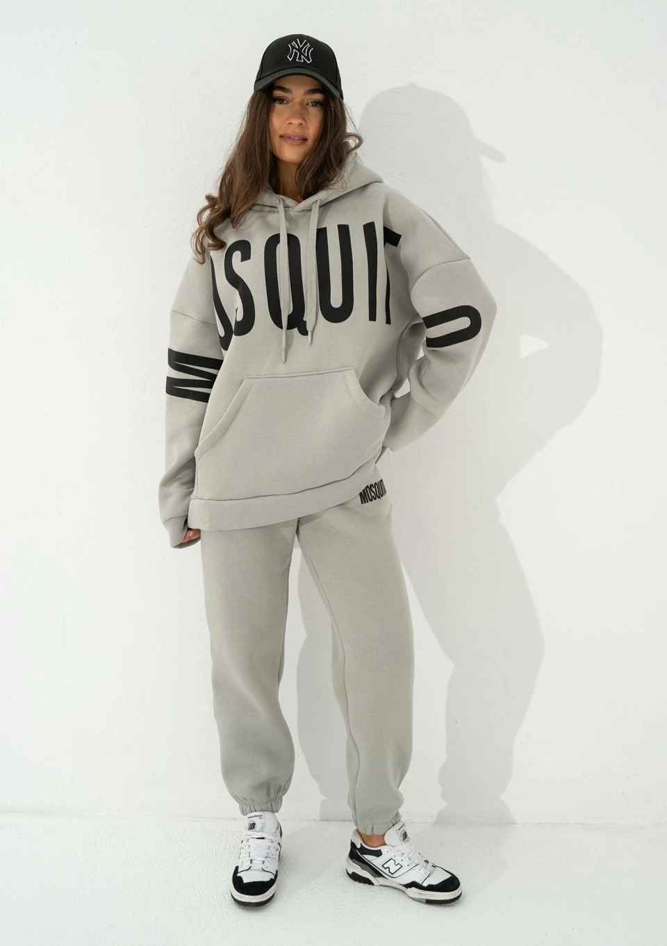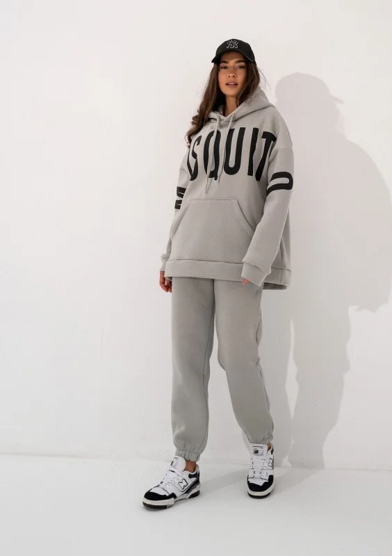 Szara bluza damska o kroju oversize. Maksymalnie luźna i wygodna. Niezwykle stylowa dzięki z dużym logiem Mosquito. Model z kapturem z troczkami i kieszenią.