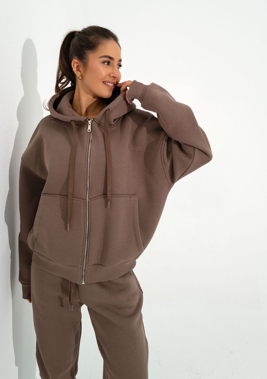 Uniwersalna bluza damska z kapturem, regulowanym dzięki długim troczkom. Wygodnie zapinana, luźny fason z kieszeniami. Model w odcieniu kawy.