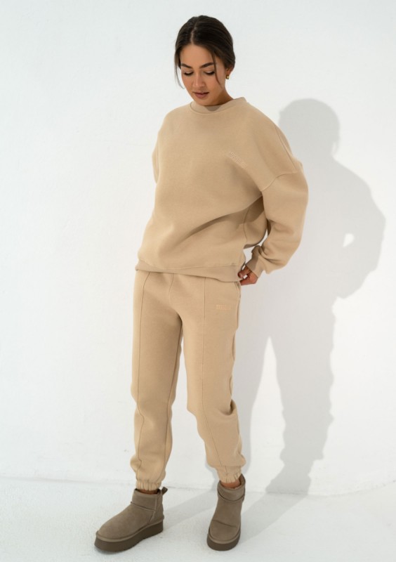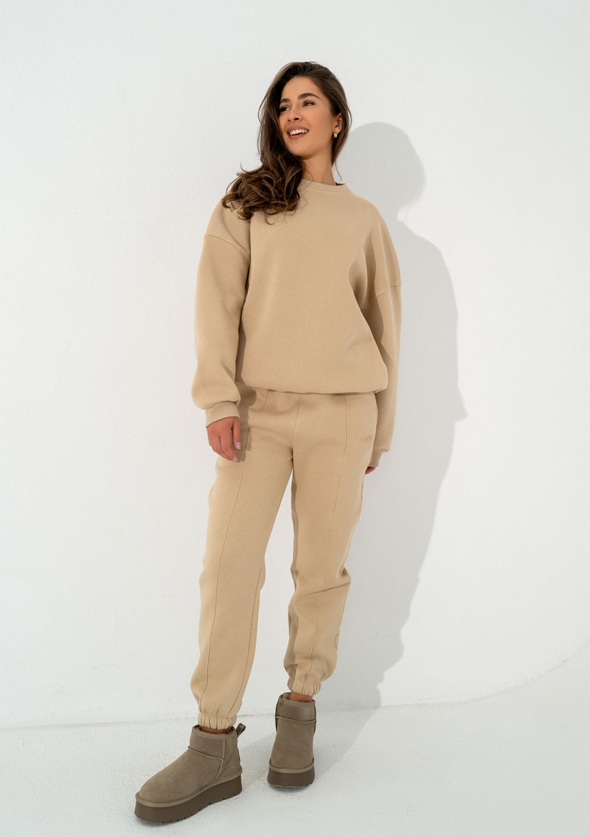 Beżowa bluza dresowa o bardzo luźnym kroju, pozbawiona detali, minimalistycznie zdobiona logiem. Wykonana z miękkiej dzianiny z meszkiem od spodu.