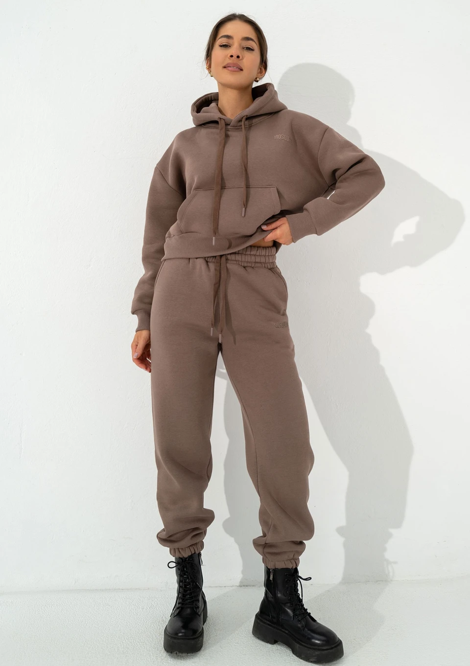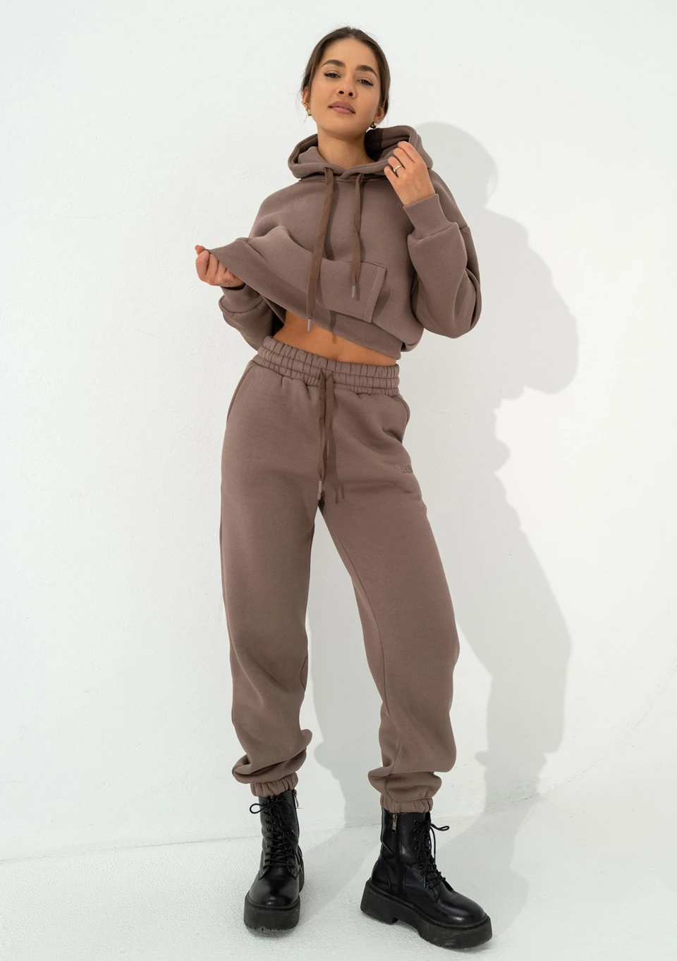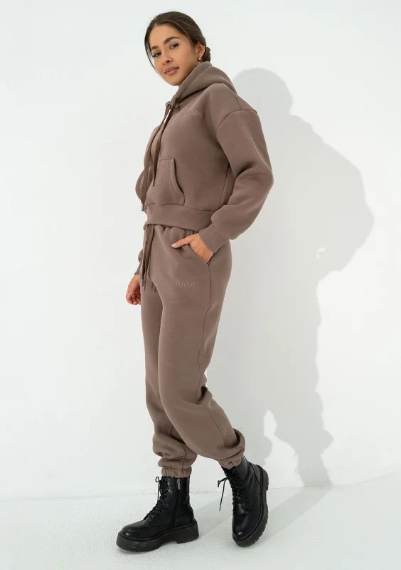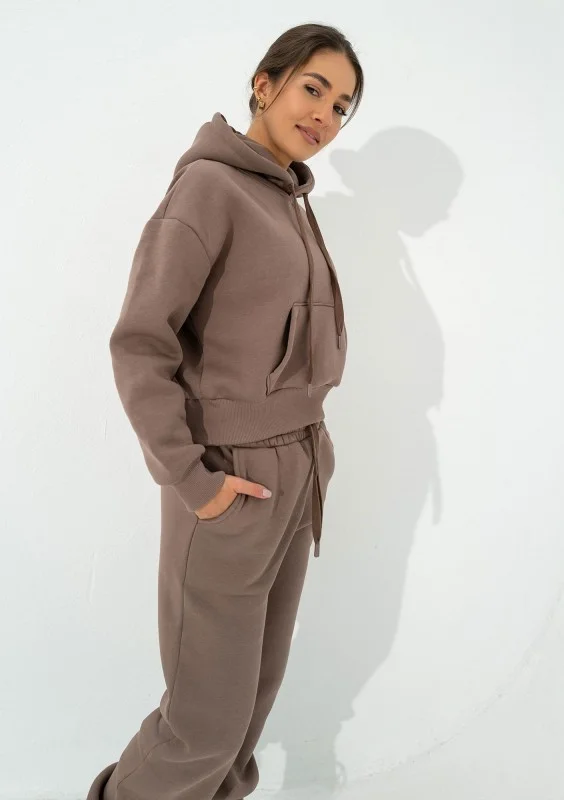 Bluza damska o krótkim kroju kangurki, z centralną kieszenią i wygodnym kapturem z troczkami. Wykonana w brązowym kolorze, z miękkiej dzianiny bawełnianej.