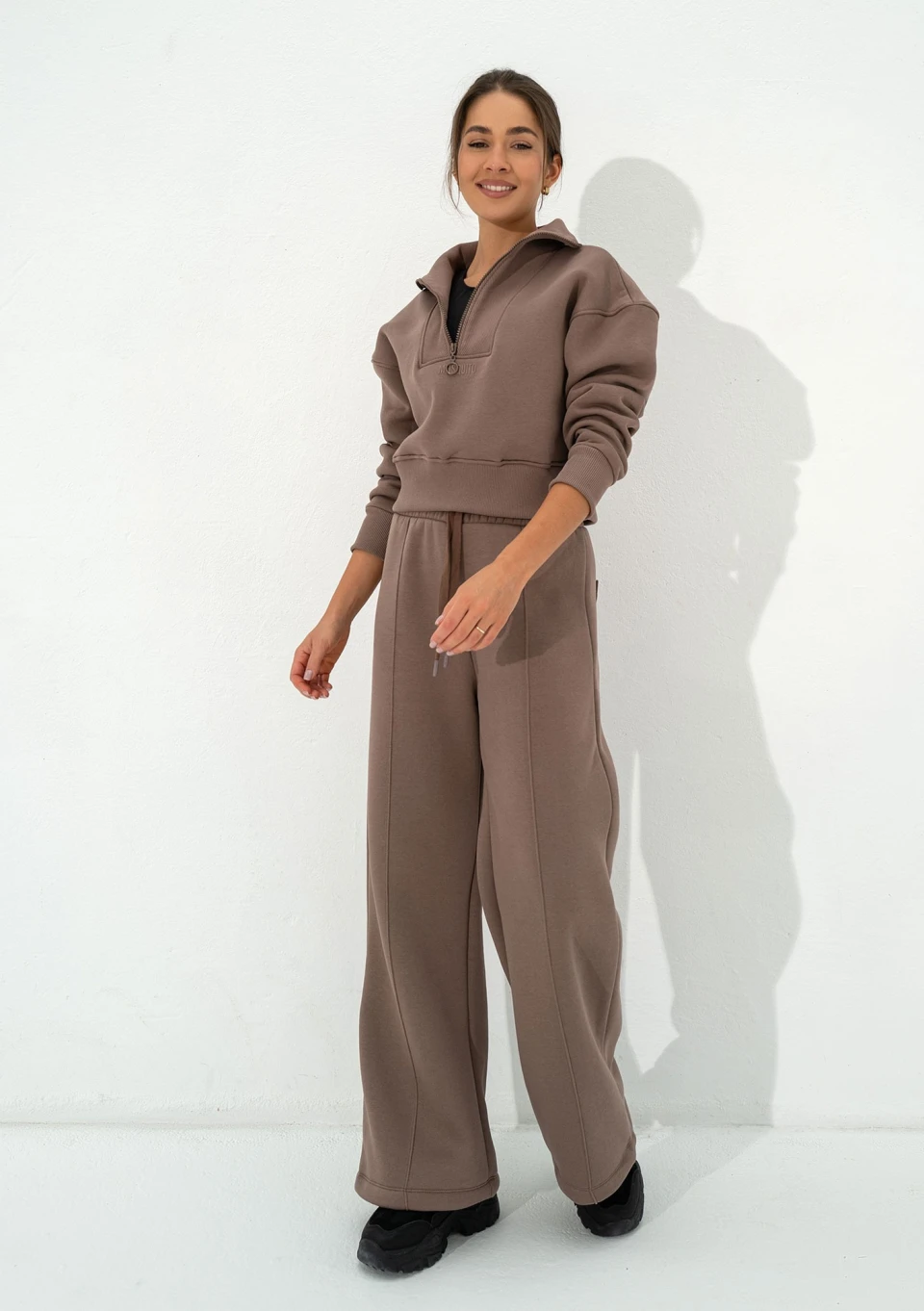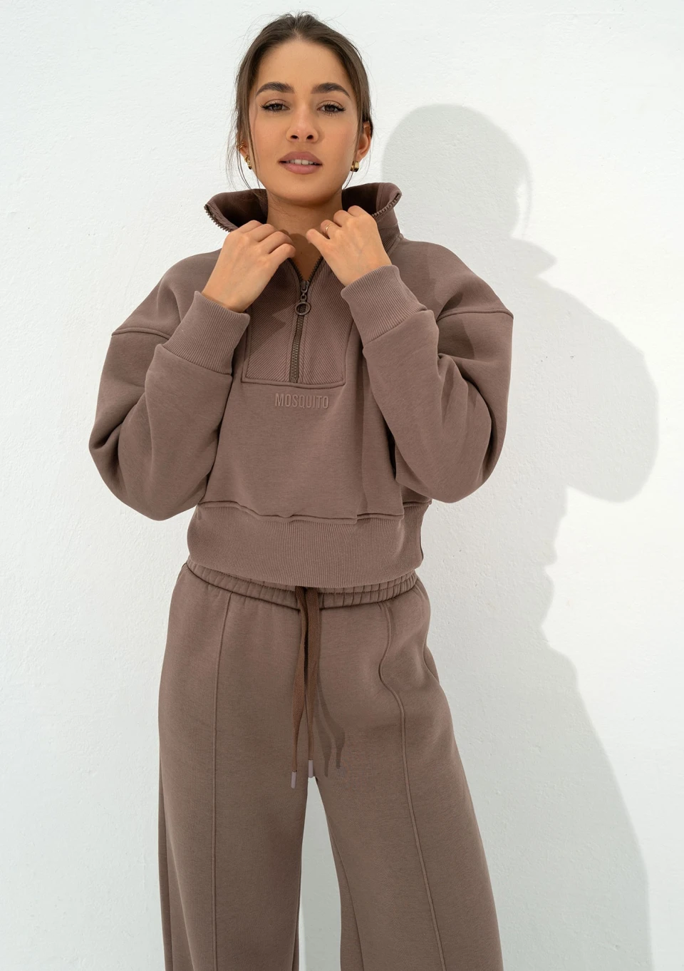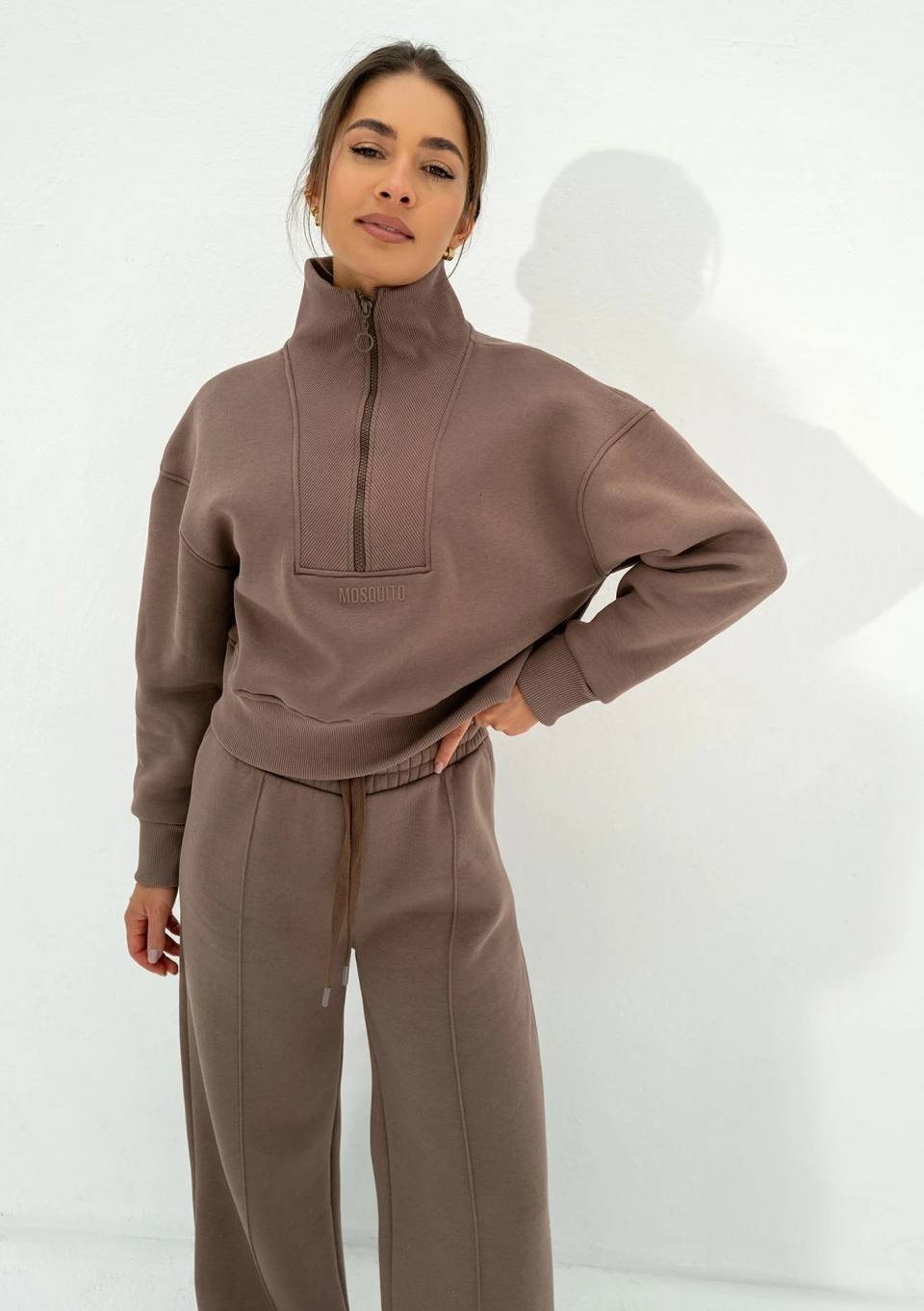 Stylowa i wygodna bluza damska ze stójką i rozpinanym dekoltem to model wykonany z bardzo miękkiej, przyjemnej w noszeniu dzianiny. Skład oczaruje Cię swoją naturalnością, to produkt niemalże w pełni bawełniany. Drobna domieszka poliestru i elastanu uplastycznia włókna, wspiera ich wytrzymałość. Malle jest bluzą elegancką, idealną na codzienne okazje, w których potrzebna będzie Ci wygoda, ale niekoniecznie sportowy styl. Pięknie dopełnia ją nasze logo, wykonane w spójnej kolorystycznie formie. Bluza jest brązowa, ma piękny, kawowy odcień, który pasuje do większości kolorów. Dedykowane spodnie dresowe również mają nazwę Malle. Jeśli nie lubisz poszerzanych nogawek, możesz połączyć ją z bardziej sportowymi fasonami Calm lub Glee.