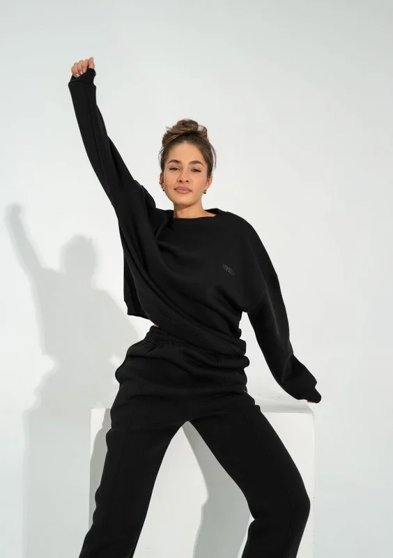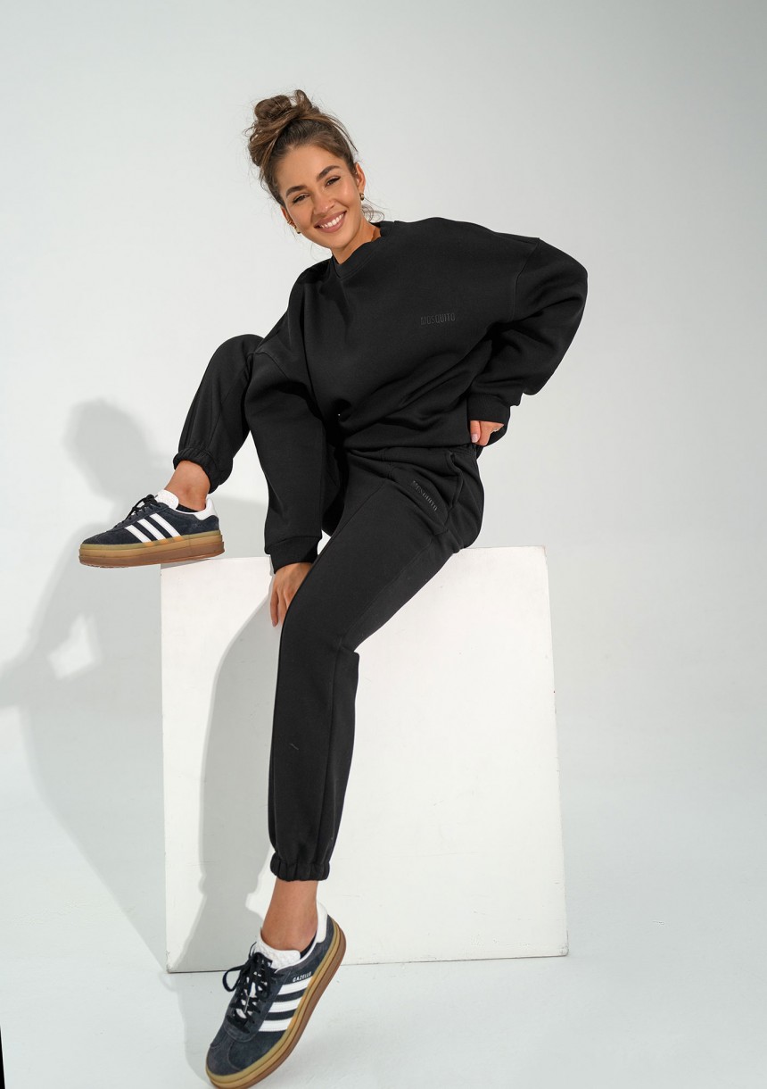 Czarna bluza dresowa o bardzo luźnym kroju, pozbawiona detali, minimalistycznie zdobiona logiem. Wykonana z miękkiej dzianiny z meszkiem od spodu.
