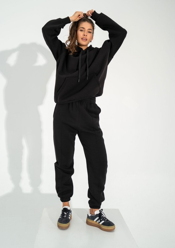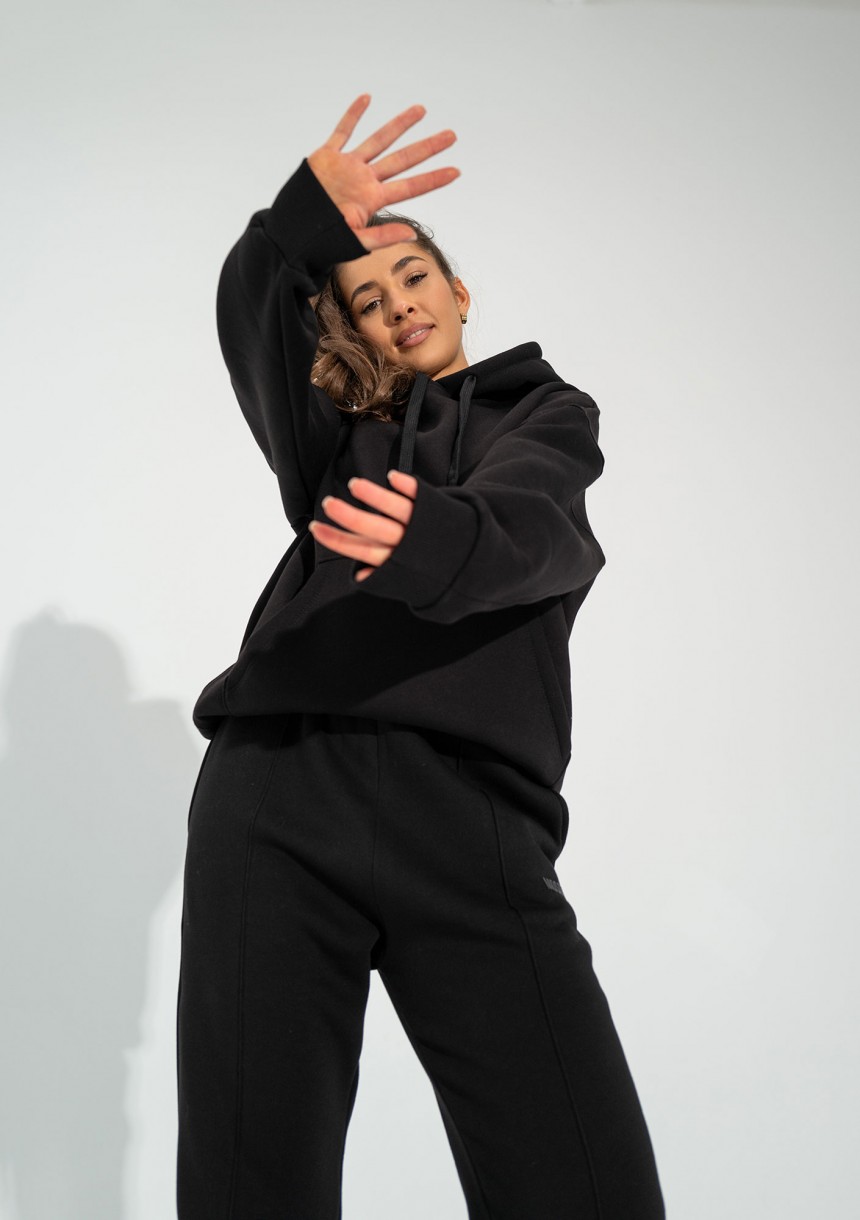 Klasyczna, luźna bluza damska z kangurkową kieszenią i wygodnym, rozłożystym kapturem z regulacją troczków. W czarnym kolorze.