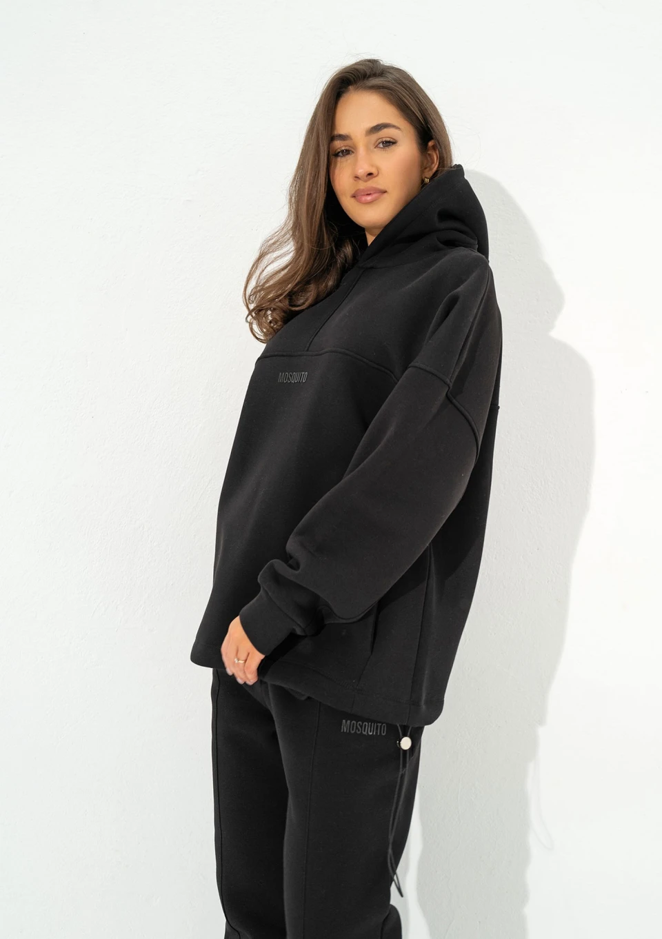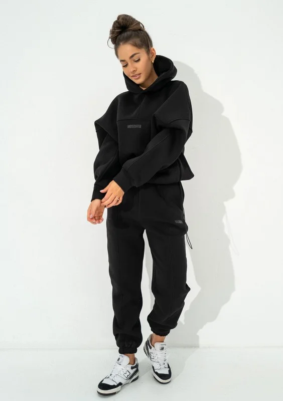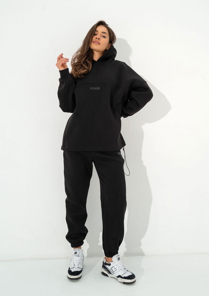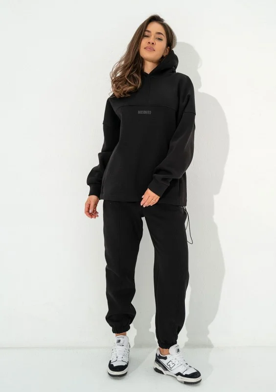 Czarna bluza kangurka oversize. Układ szwów nadaje jej wyjątkowego charakteru, a kieszenie, kaptur i dolny troczek tworzą pełną funkcjonalność.