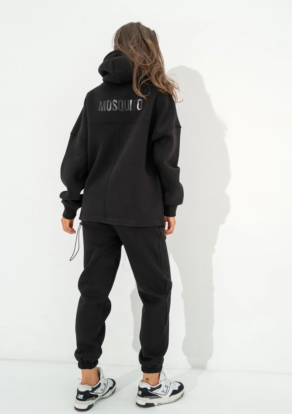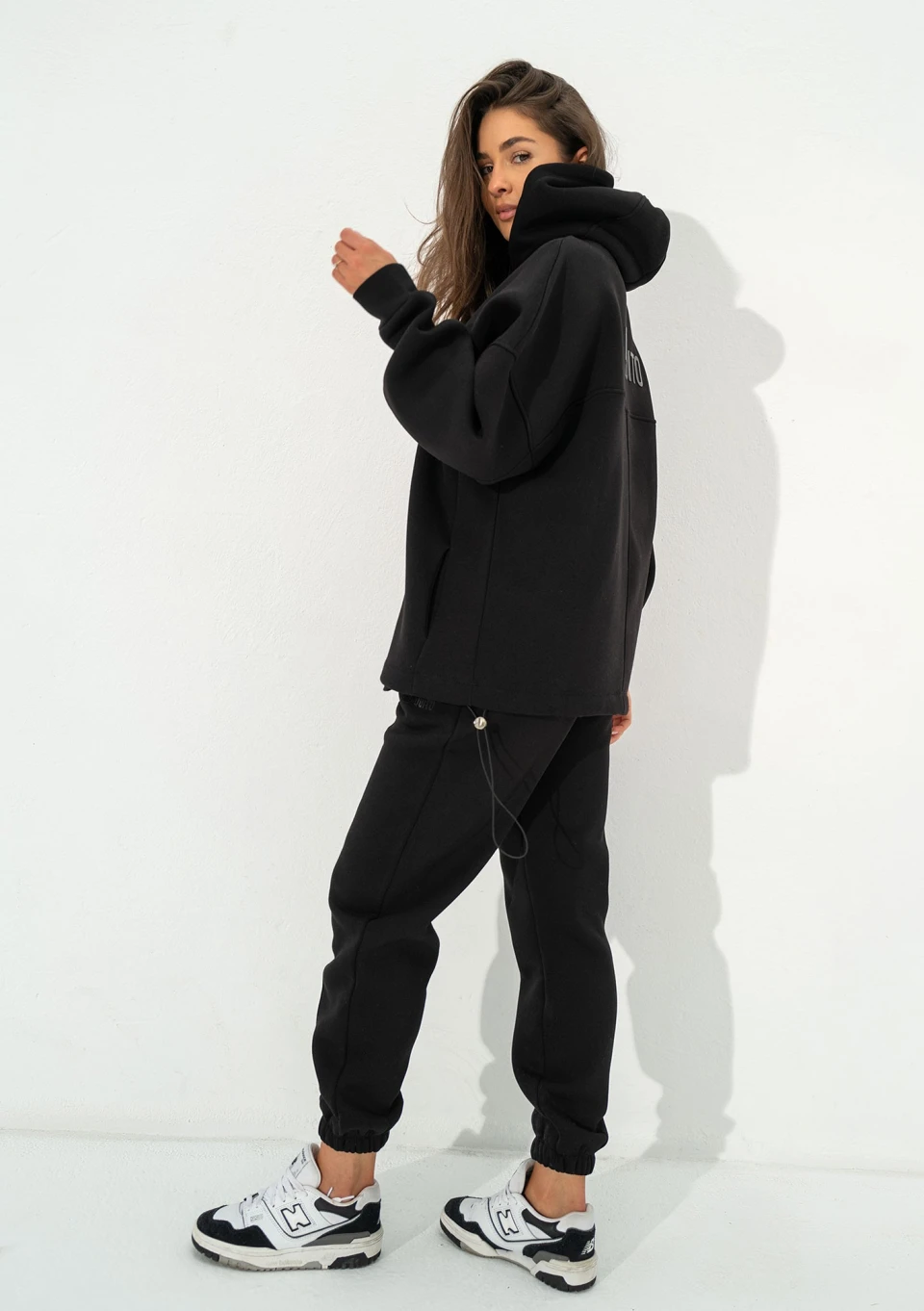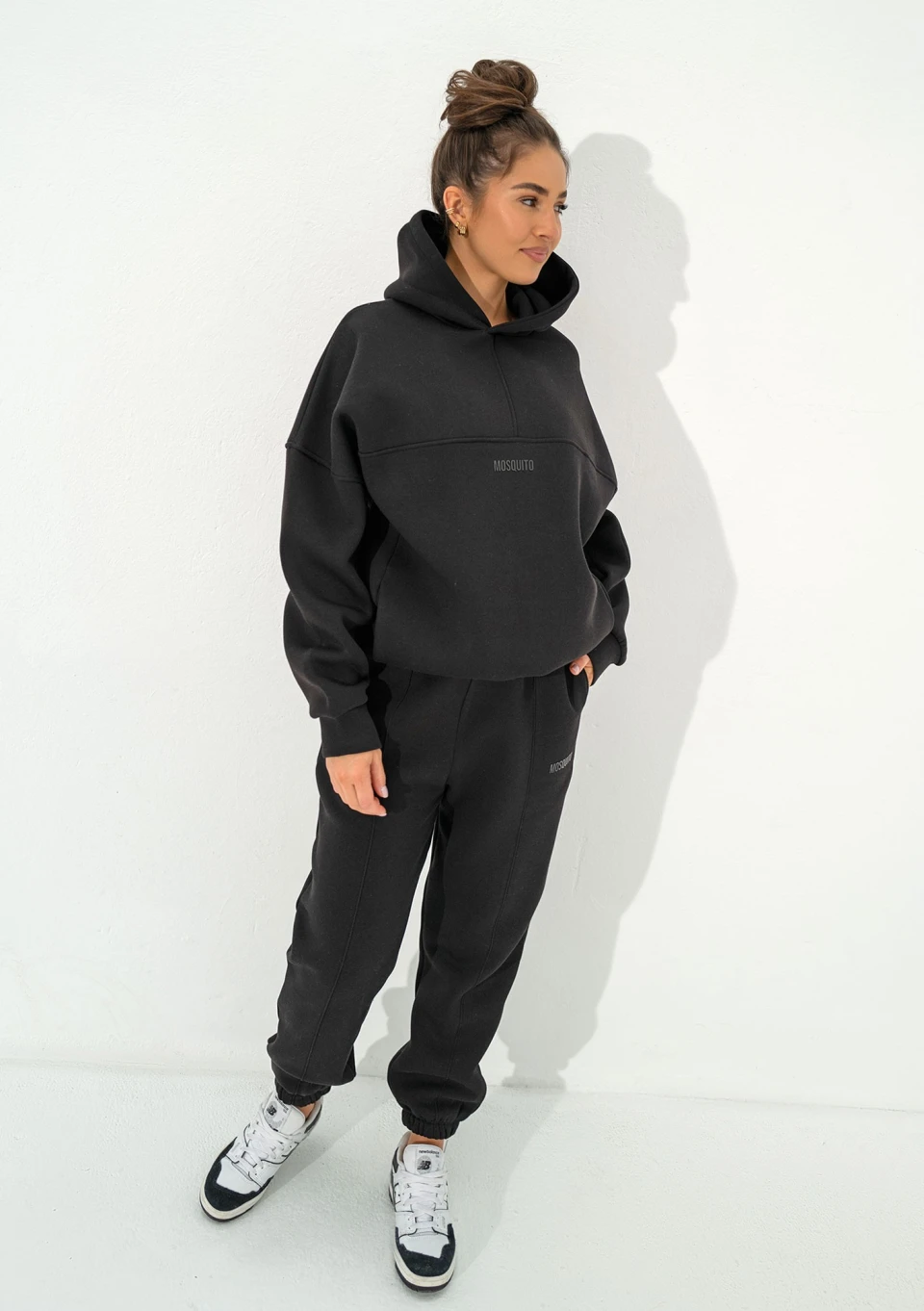 Czarna bluza kangurka oversize. Układ szwów nadaje jej wyjątkowego charakteru, a kieszenie, kaptur i dolny troczek tworzą pełną funkcjonalność.