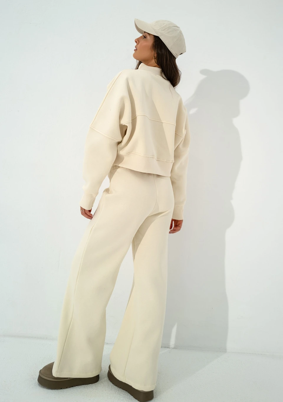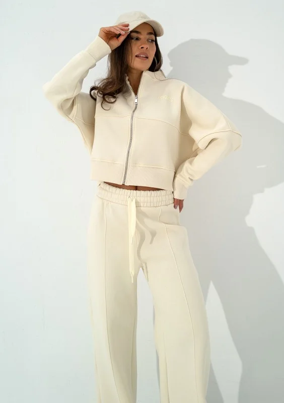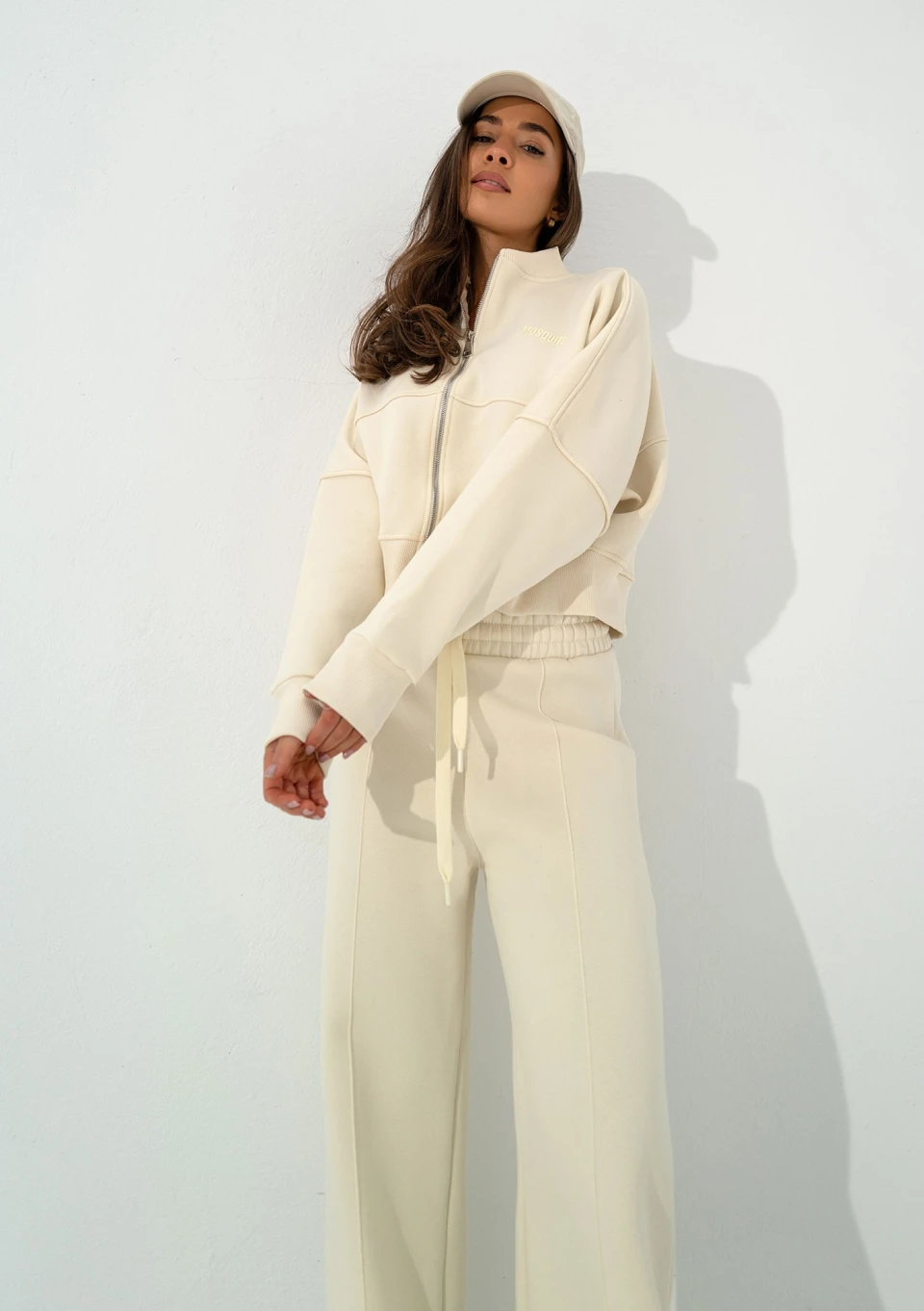 Kremowa bluza damska o wygodnym, rozpinanym kroju, ze stójką. Bardzo uniwersalna. Idealna na każdą okazję, dzięki małej ilości sportowych detali.