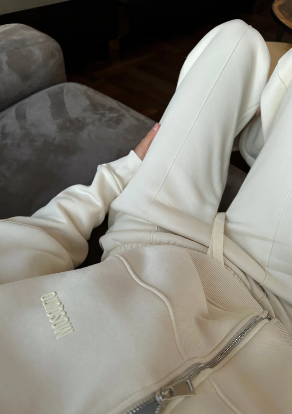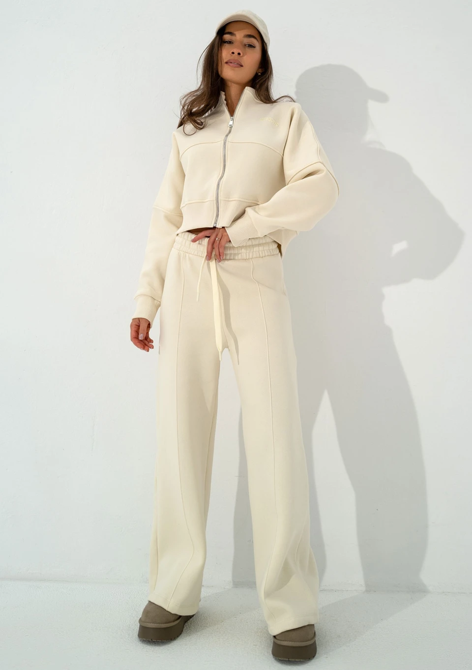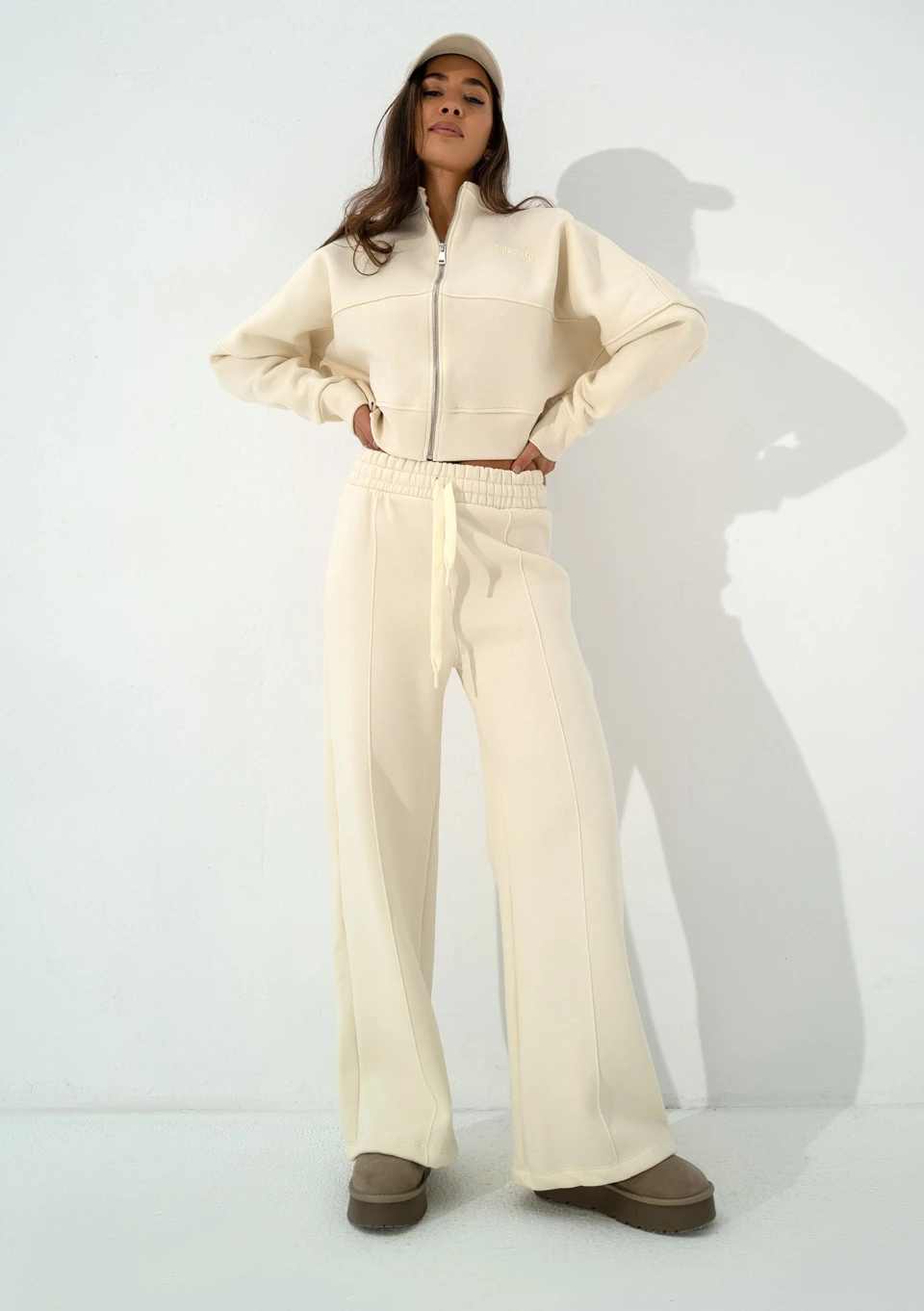 Kremowa bluza damska o wygodnym, rozpinanym kroju, ze stójką. Bardzo uniwersalna. Idealna na każdą okazję, dzięki małej ilości sportowych detali.