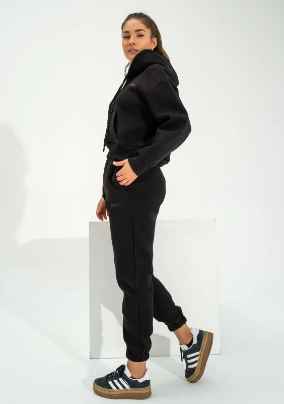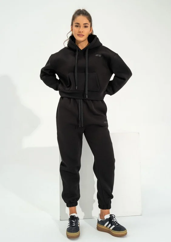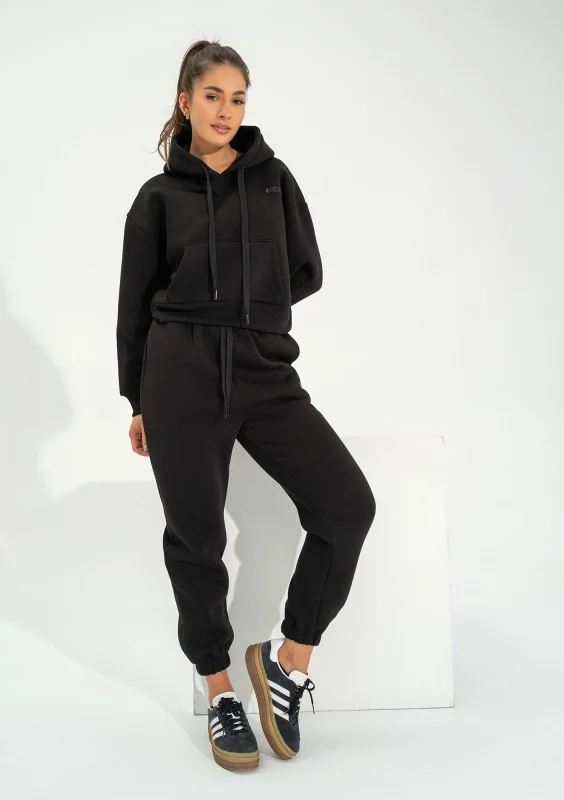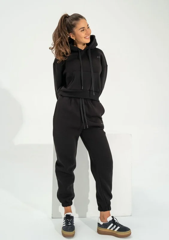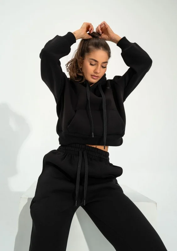 Czarna bluza kangurka damska o krótkim kroju, z miękkiej dzianiny bawełnianej. Funkcjonalna, wyposażona w kaptur z troczkami i centralną kieszeń.