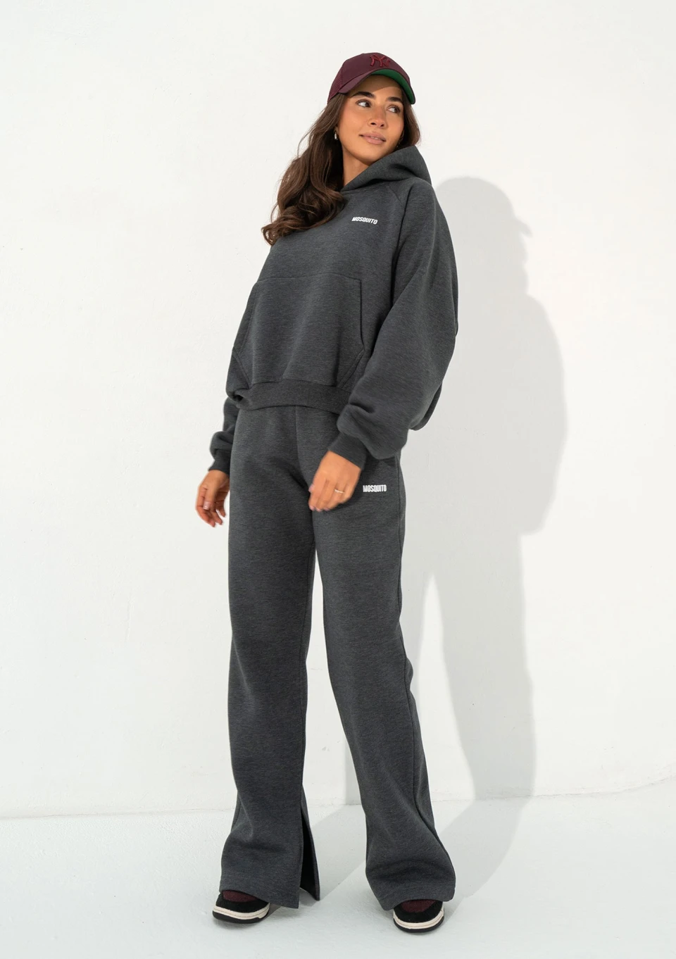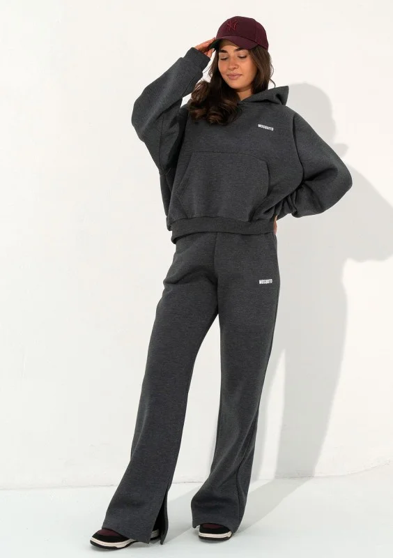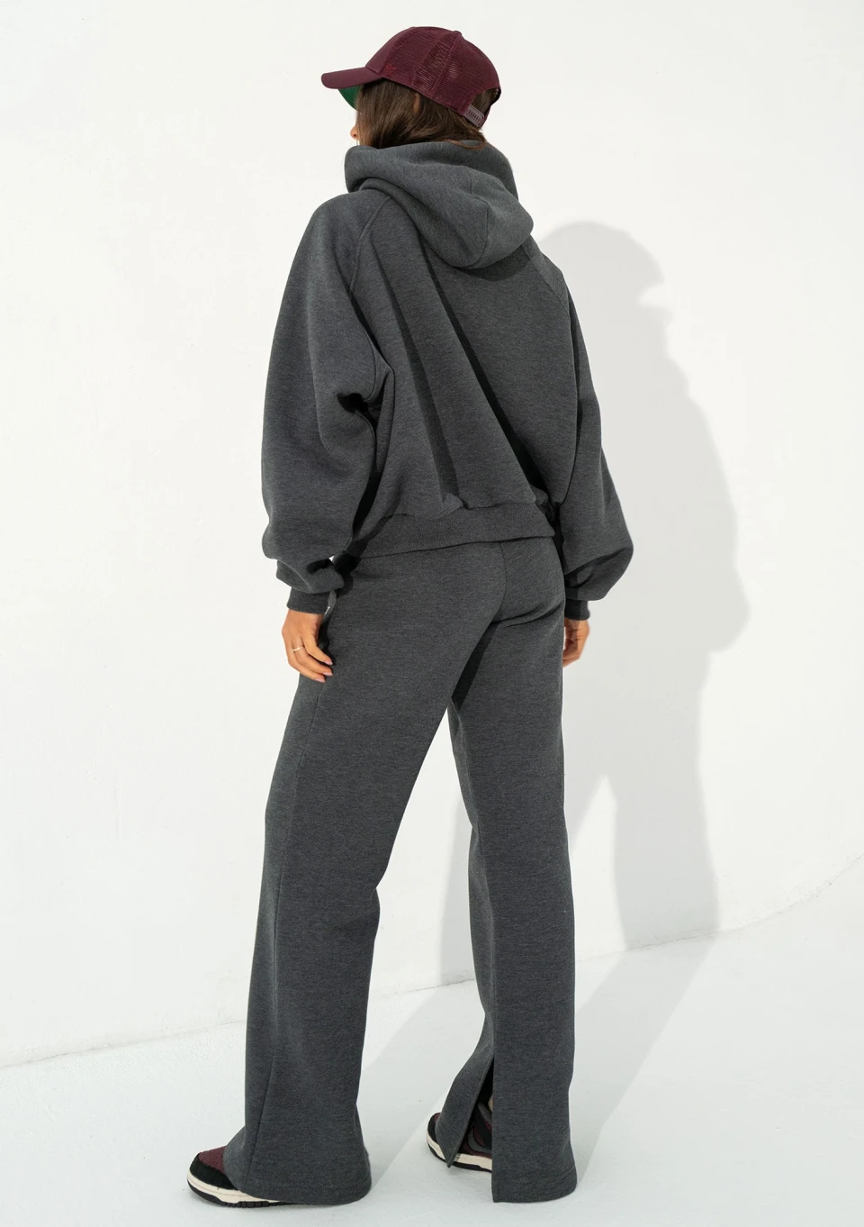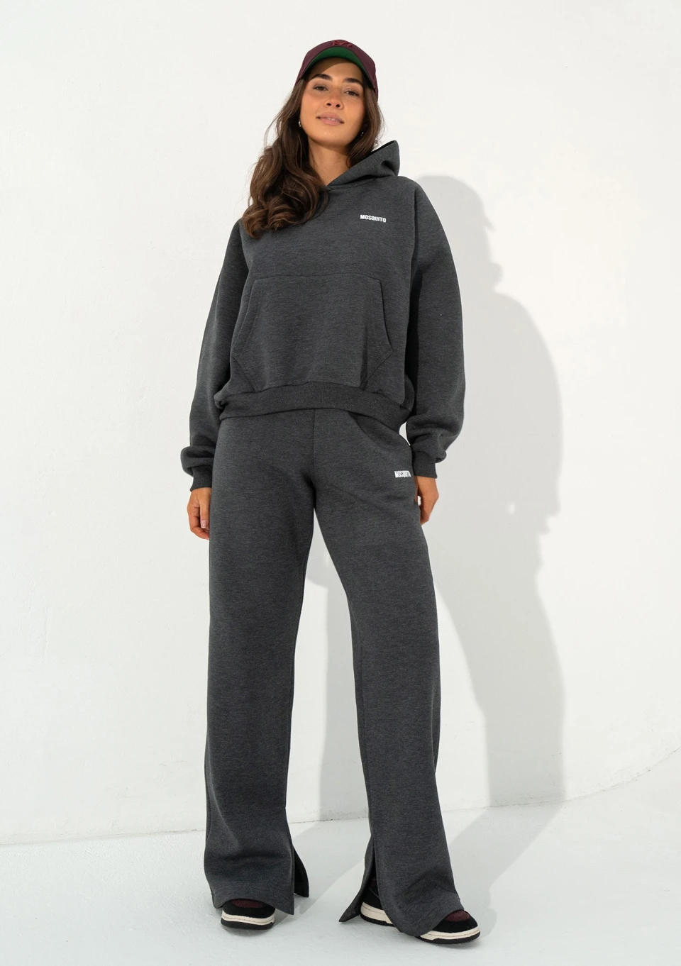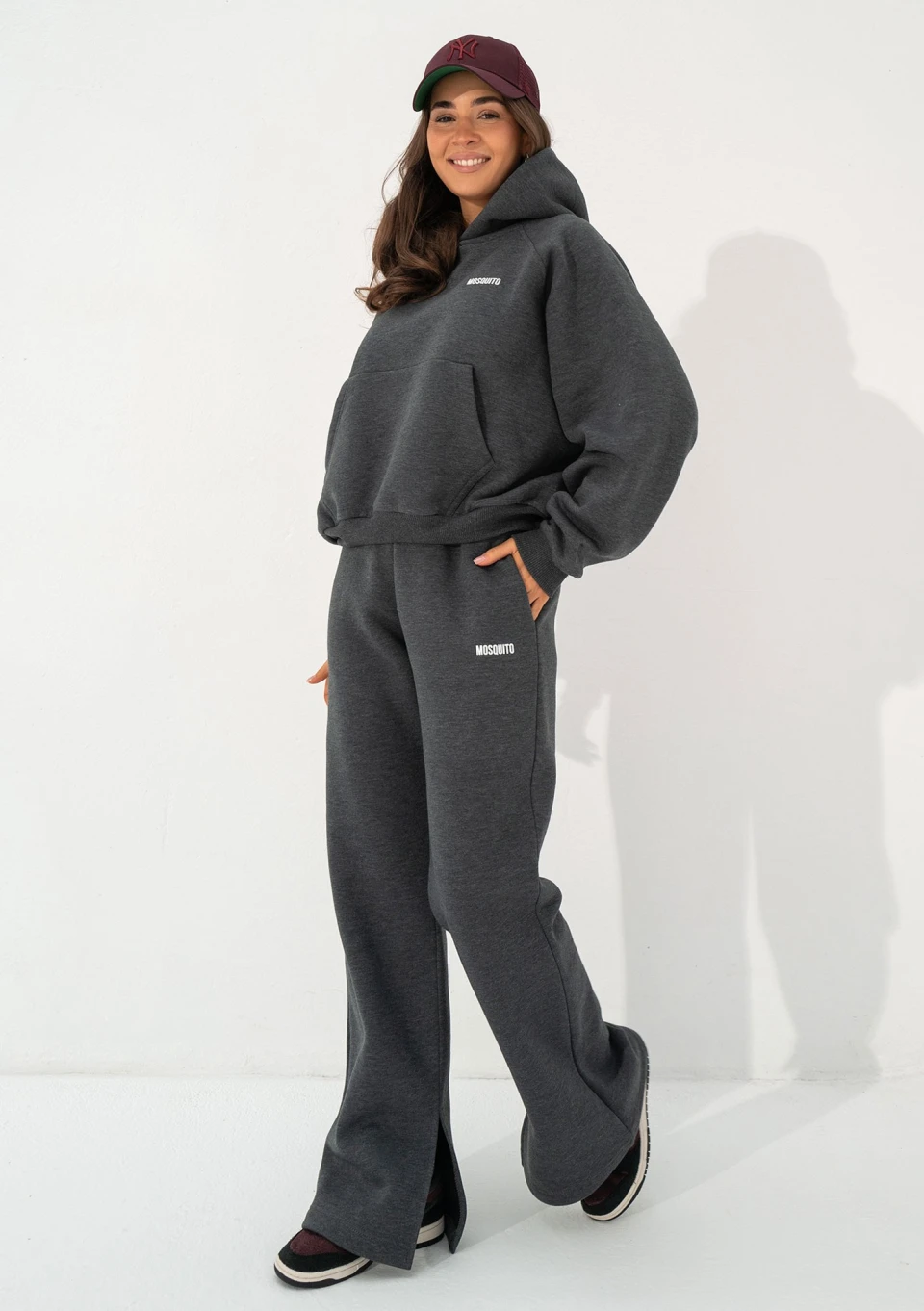 Grafitowa bluza damska z kapturem i kieszenią. Modnie oversize'owa, o standardowej długości. Wygodnie obszyta ściągaczem.