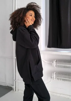 Fason luźny, długi, z kieszenią i kapturem, z rozcięciami po bokach.