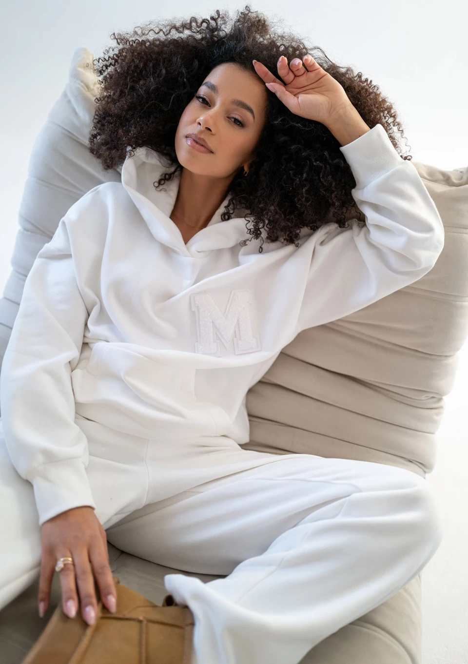 Biała bluza dresowa z kapturem, klasyczna kangurka. Model Smart ozdobiony jest naszywką ,,M" - stylowym symbolem marki.