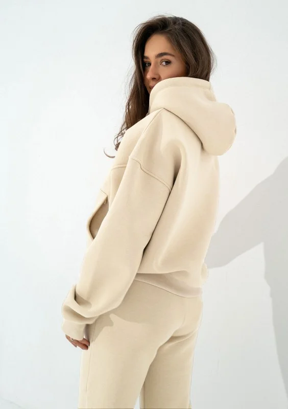 Szukasz uniwersalnej bluzy damskiej z kapturem i zamkiem? Postaw na najwygodniejszy fason z zapięciem. Kremowa bluza dresowa z naszej kolekcji, stworzona w polskiej szwalni, to strzał w dziesiątkę. Wykonana z miękkiej bawełny, z subtelnym logo, idealnie dopasuje się do każdego stroju – od sportowego po casualowy.