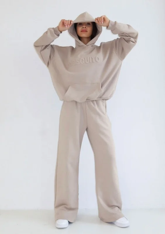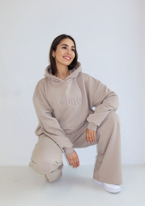 Beżowa bluza damska o kroju oversize z modnie wytłaczanym logiem. Wykonana w wygodnej formie kangurki z pojemną kieszenią i kapturem.