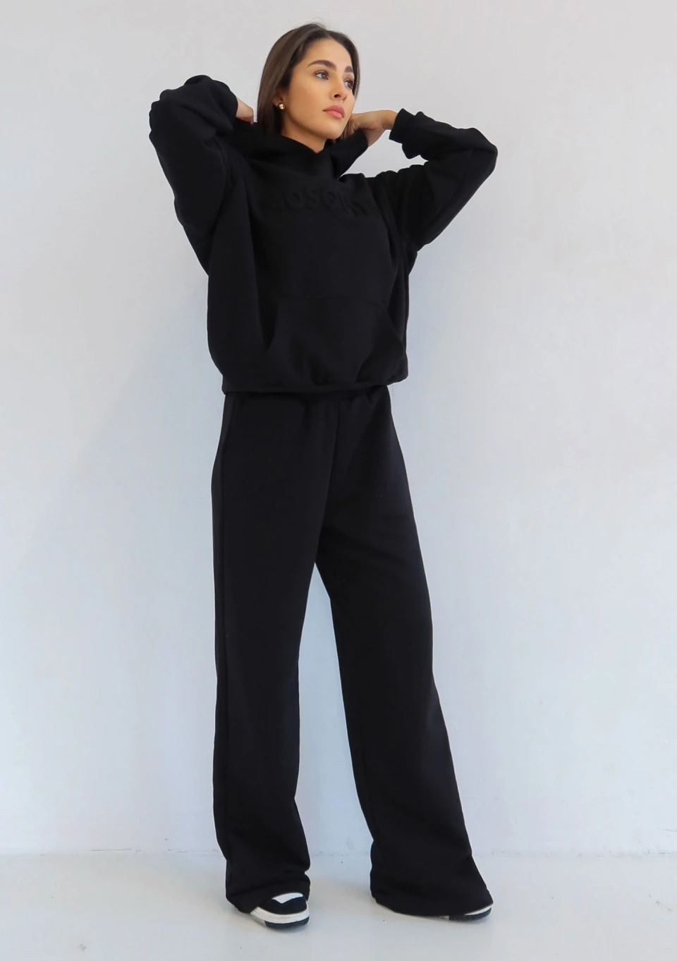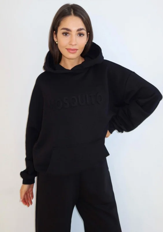 Czarna kangurka z linii Verve to funkcjonalna i wygodna bluza damska z kapturem i kieszenią o kroju oversize. Wyróżnia się stylowym, ,,wytłaczanym" logiem.