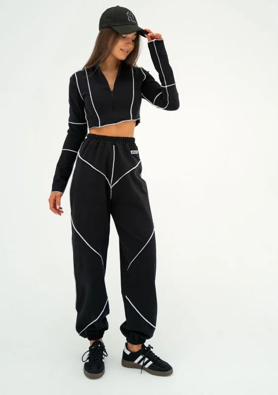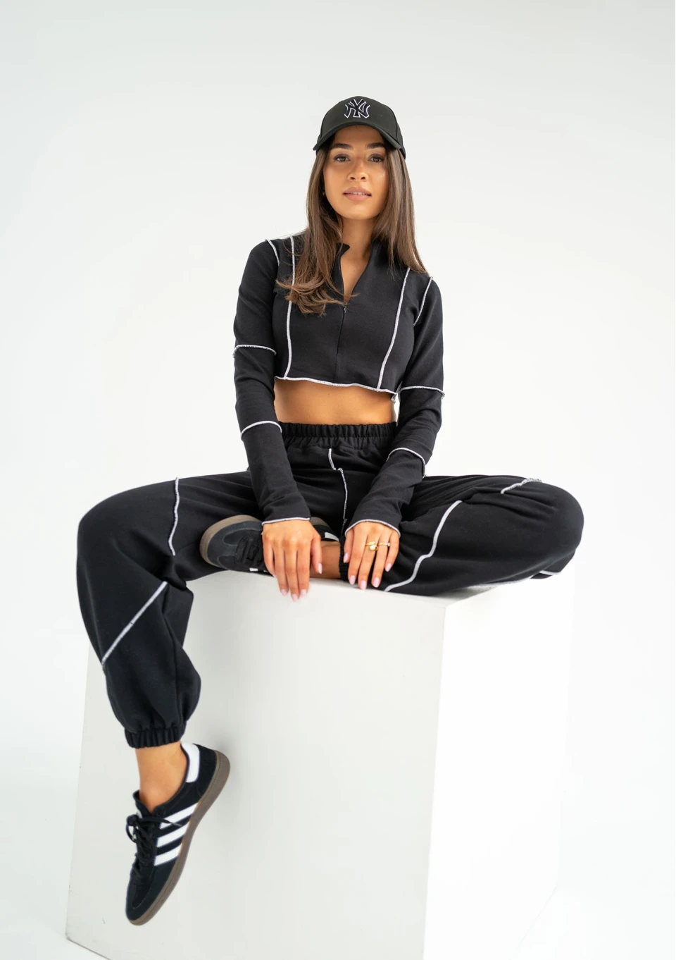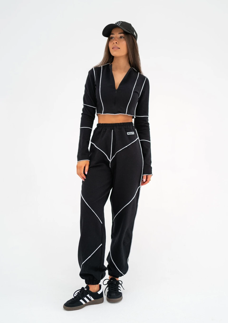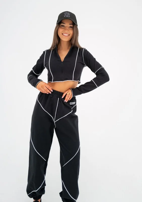 Lekka, bawełniana bluza damska w czarnym kolorze, designersko przełamana białym obszyciem. Model o krótkim kroju, z rozpinanym dekoltem.