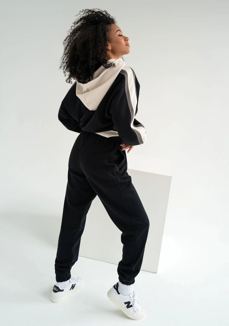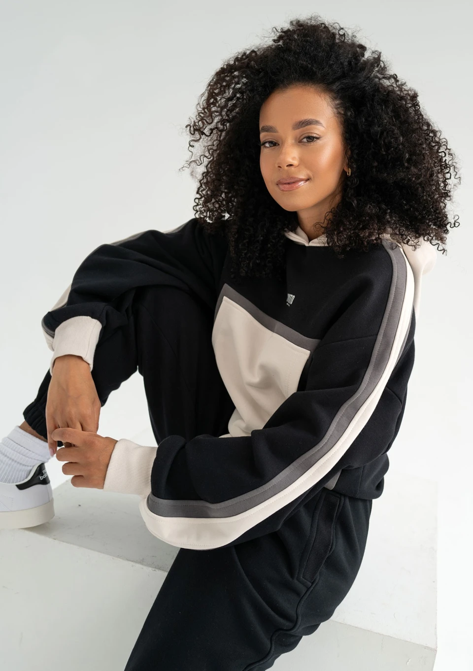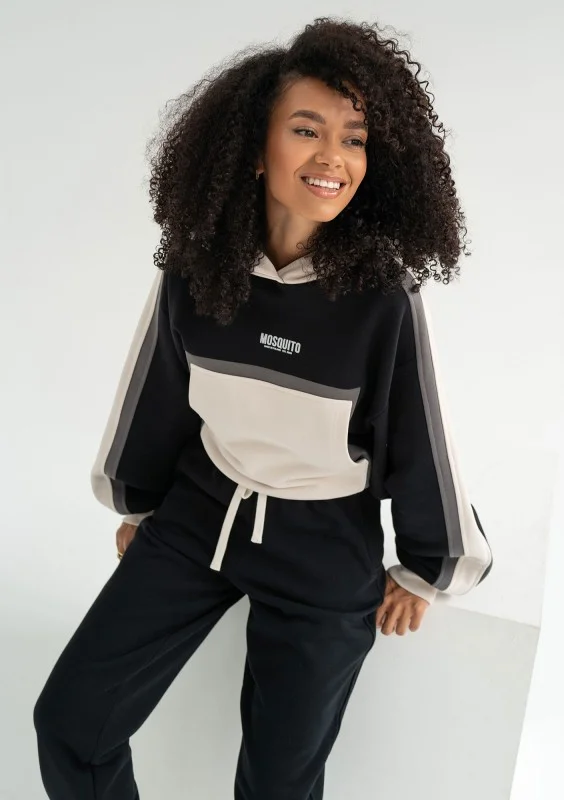 Wyjątkowa bluza damska z kapturem z trzema kolorami. Wygodny fason z kangurową kieszenią i ściągaczami, zdobiony drobnym nadrukiem loga.