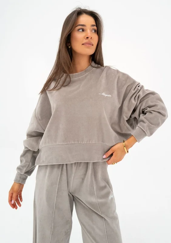 Komfortowa, modna bluza oversize w eleganckim odcieniu taupe. Wykonana z miękkiego weluru, podkreślona eleganckim logiem Mosquito.