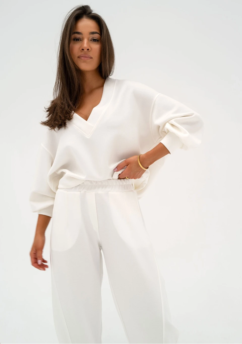 Biała bluza damska Ollie jest jak muśnięcie chmur, delikatna i otulająca. Ten model to kwintesencja elegancji i wygody. Wykonany z najwyższej jakości, niezwykle miłej w dotyku dzianiny. Klasyczny dekolt w serek subtelnie podkreśla kobiecość, a brak sportowych detali, takich jak kaptur, nadaje jej wyrafinowany charakter.