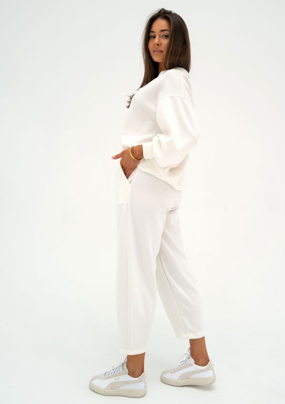 Biała bluza damska Ollie jest jak muśnięcie chmur, delikatna i otulająca. Ten model to kwintesencja elegancji i wygody. Wykonany z najwyższej jakości, niezwykle miłej w dotyku dzianiny. Klasyczny dekolt w serek subtelnie podkreśla kobiecość, a brak sportowych detali, takich jak kaptur, nadaje jej wyrafinowany charakter.