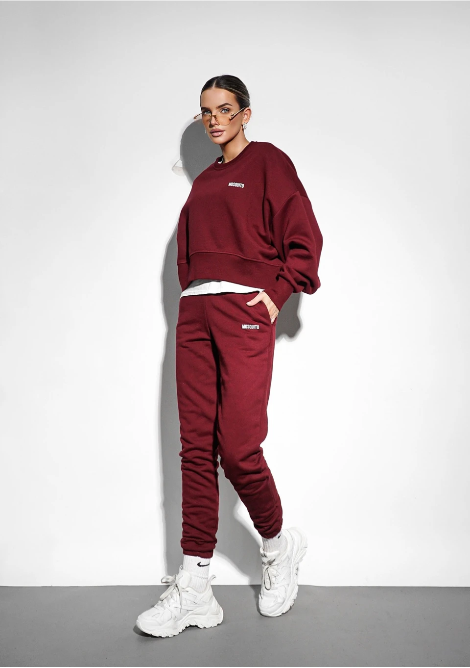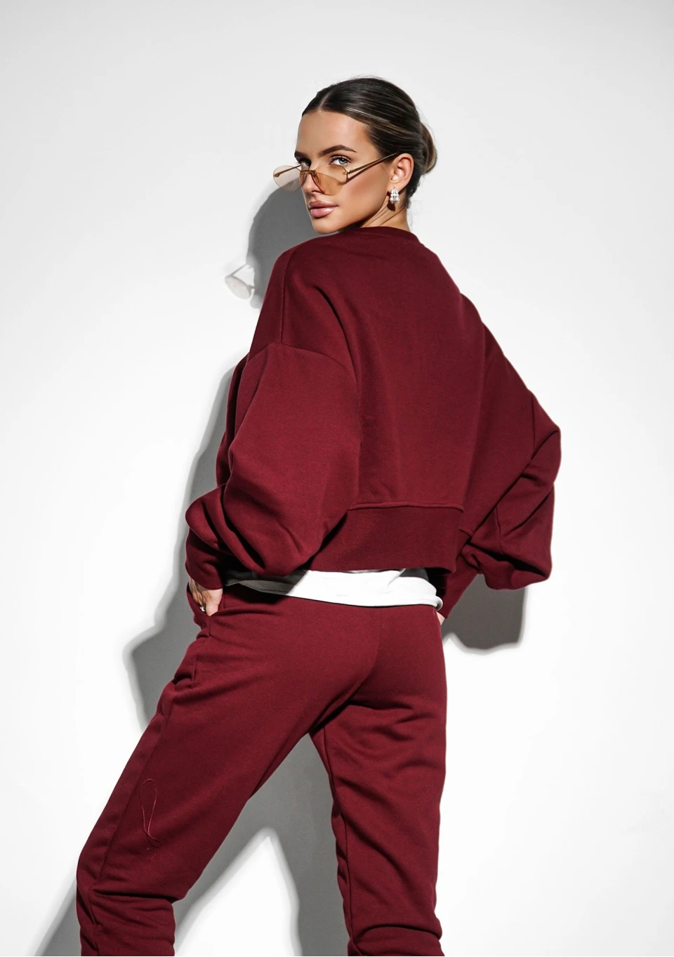 Bluza o modnym kroju oversize, swobodnie wykończona szerokim ściągaczem. Wykonana w bordowym kolorze.