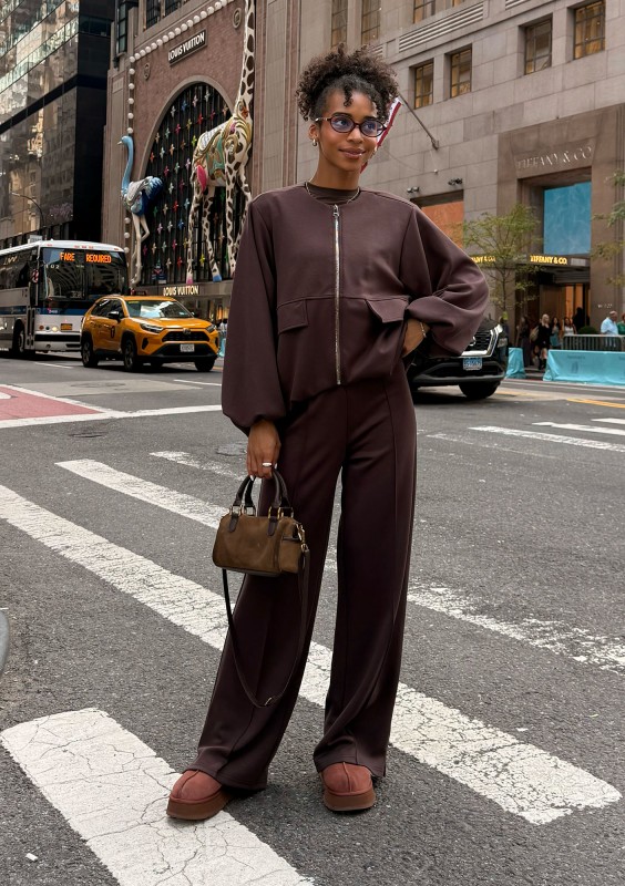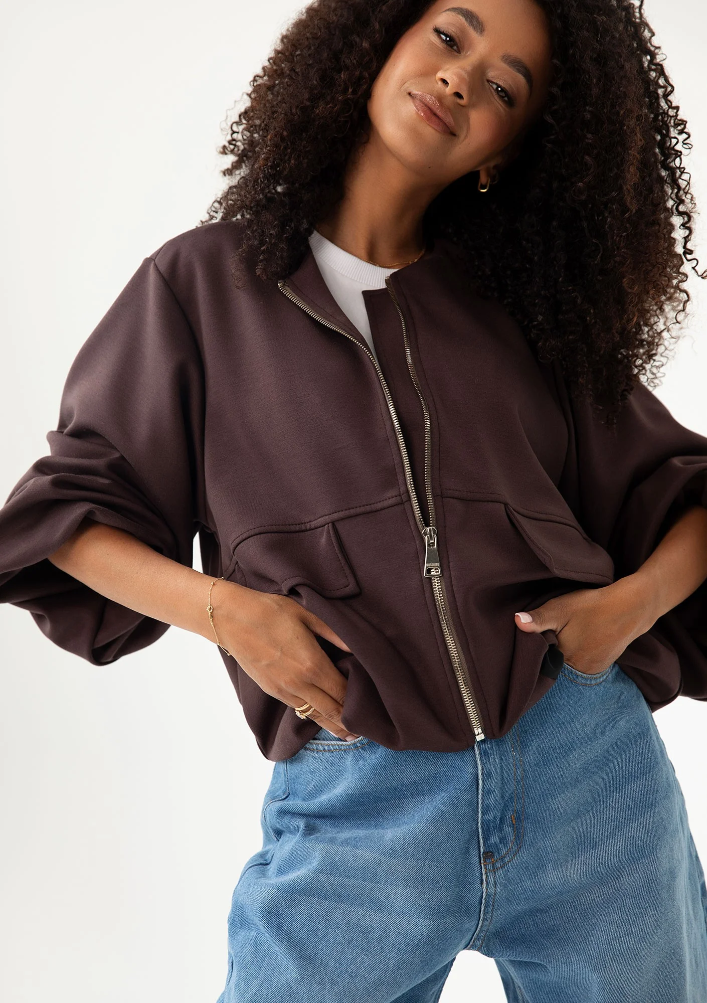 Brązowa bluza bomberka oversize z tej linii to fason z wyjątkowej dzianiny typu masełko. To przyjemnie miękki i strukturalnie bardzo trwały materiał, który elegancko układa się, bez tendencji do gniecenia. Zwróć uwagę na staranne detale fasonu: dzięki podszyciu tylnego wykończenia bluza zawsze ułoży swój stylowy, bomberkowy kształt. Elegancki zamek błyskawiczny pozwoli Ci cieszyć się wygodną, przejściową formą okrycia w zmiennych warunkach. Tę bluzę możesz wystylizować w spójnym wydaniu kompletu. Połącz ją ze spodniami Taro, są wykonane z tej samej dzianiny.