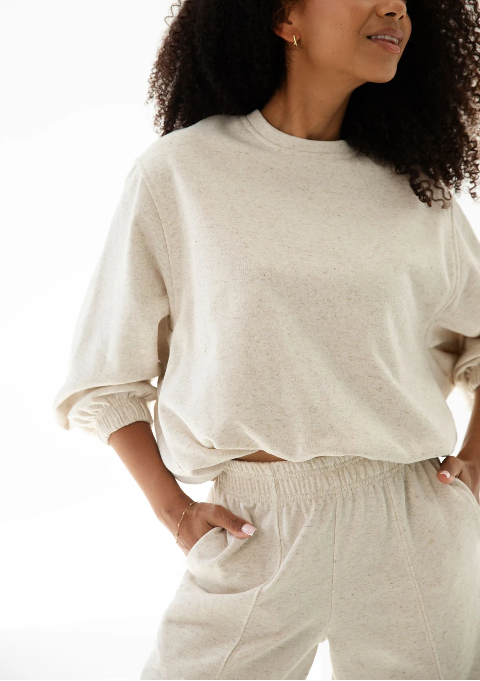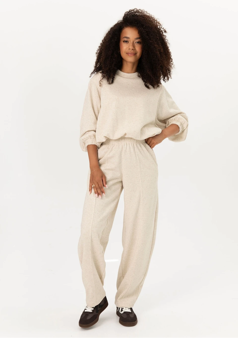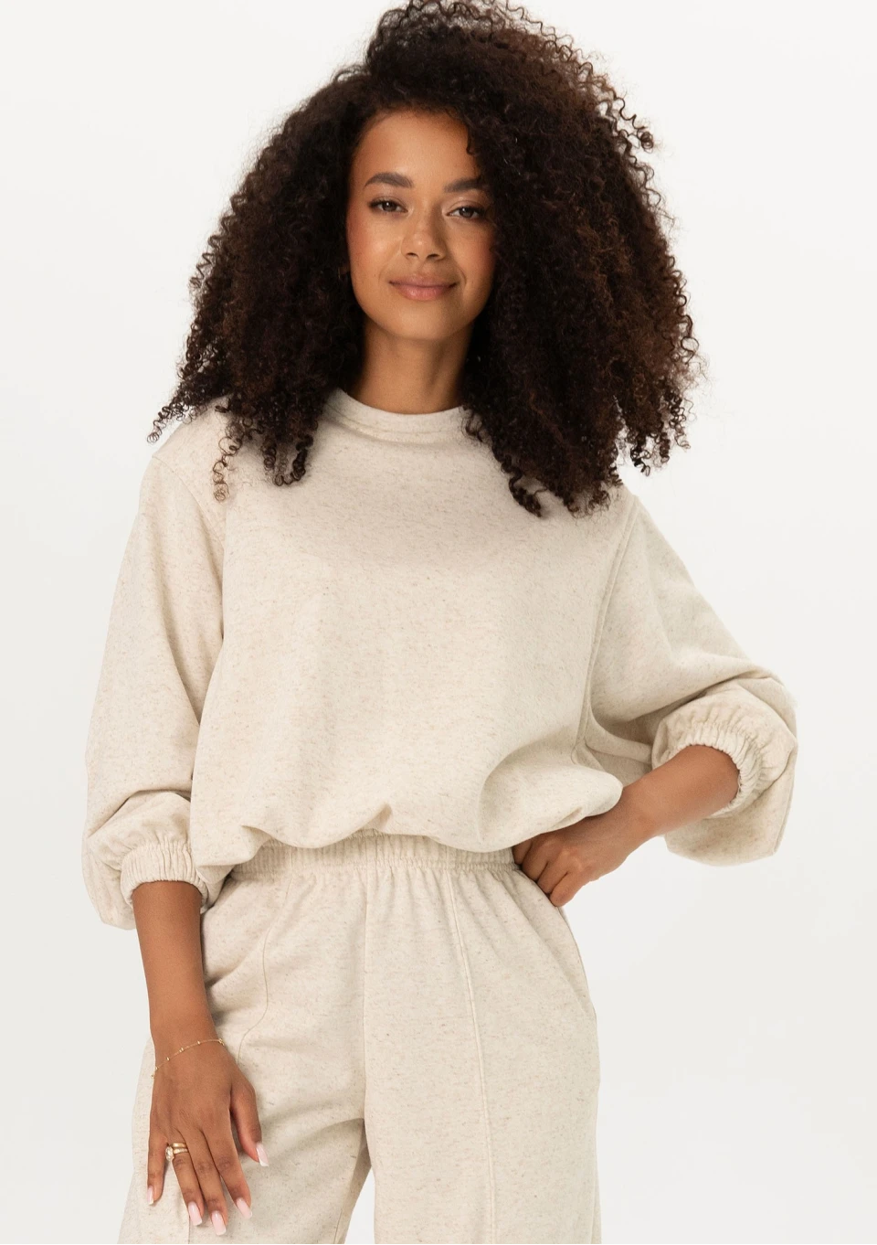Fason bluzy Puff to najmodniejszy typ bombki: luźna i obszerna góra swobodnie opada, dół jest ściągnięty, co powoduje lekkie marszczenie i zebranie materiału na wysokości pasa spodni. To właśnie ten efekt nadaje bluzie charakterystyczną formę. Rękawy są również luźne i wykończone na końcach ściągaczem. Prezentujemy model wykonany z miękkiej, bawełnianej dzianiny pętelkowej, w kolorze beżowym. Bluza ma melanżowy deseń.