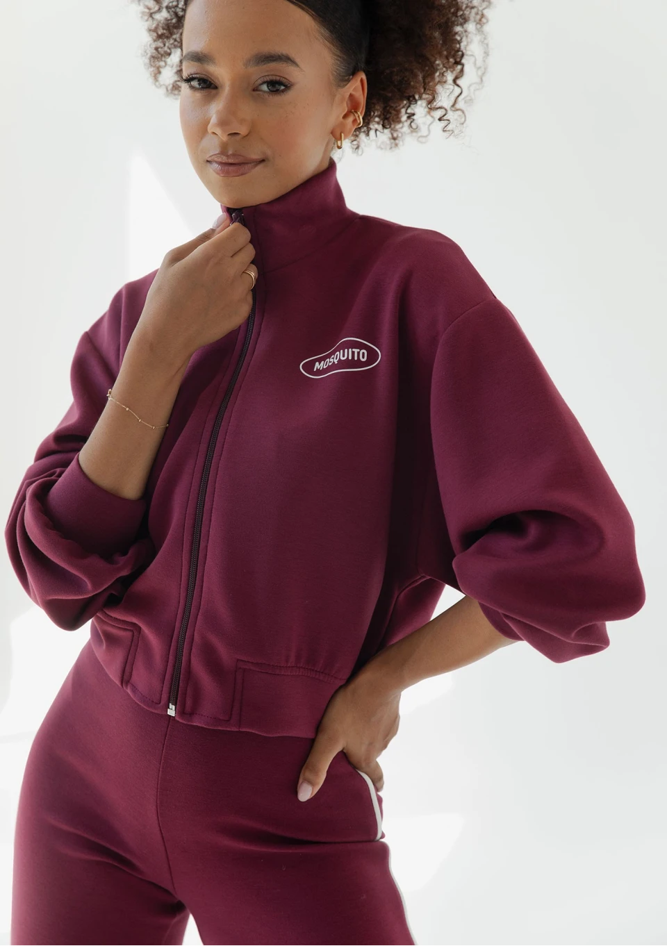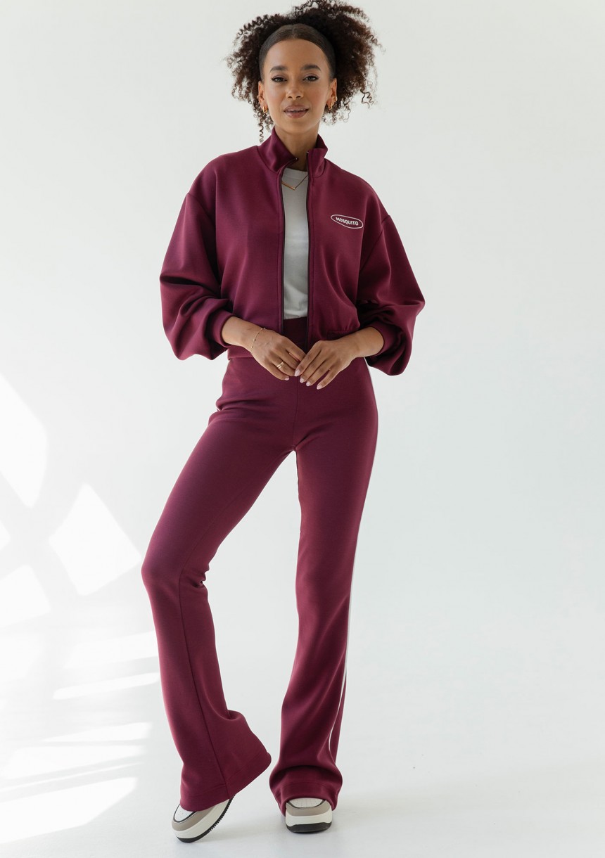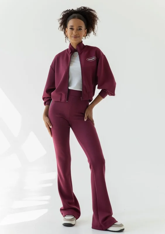 Bordowa bluza damska o krótkim kroju, wygodnie zapinana, wykończona stójką. Wykonana z wyjątkowej dzianiny z modalem, świetnie układa się na sylwetce.