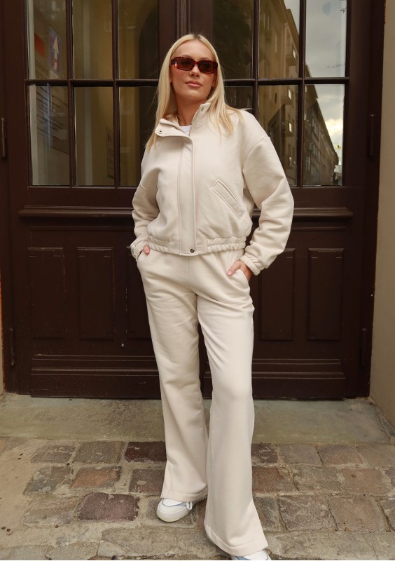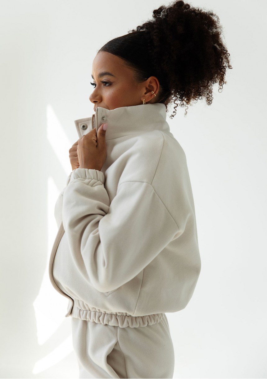 Bluza damska o wygodnym kroju bomberki, rozpinana i wyposażona w kieszenie. Uszyta z miękkiego materiału w kokosowym odcieniu.