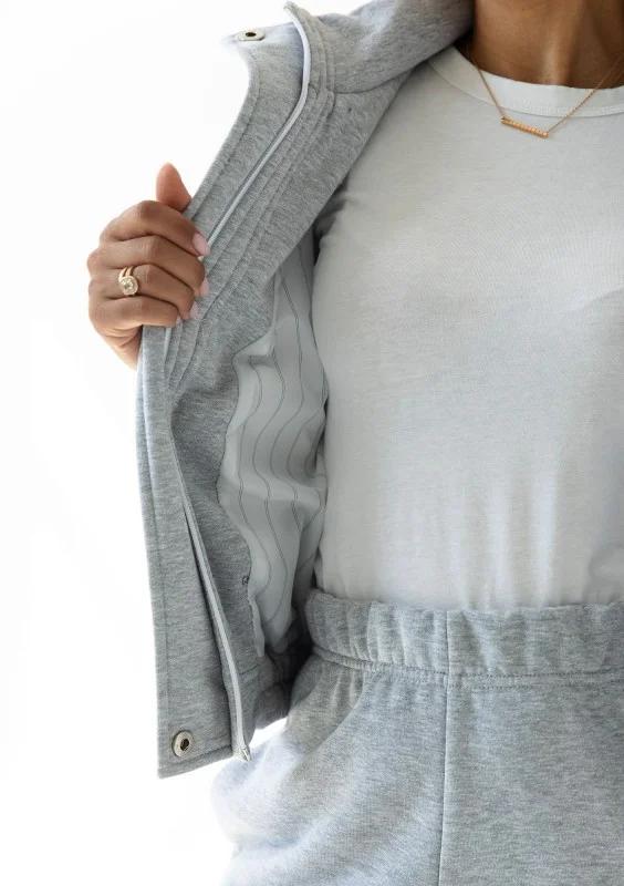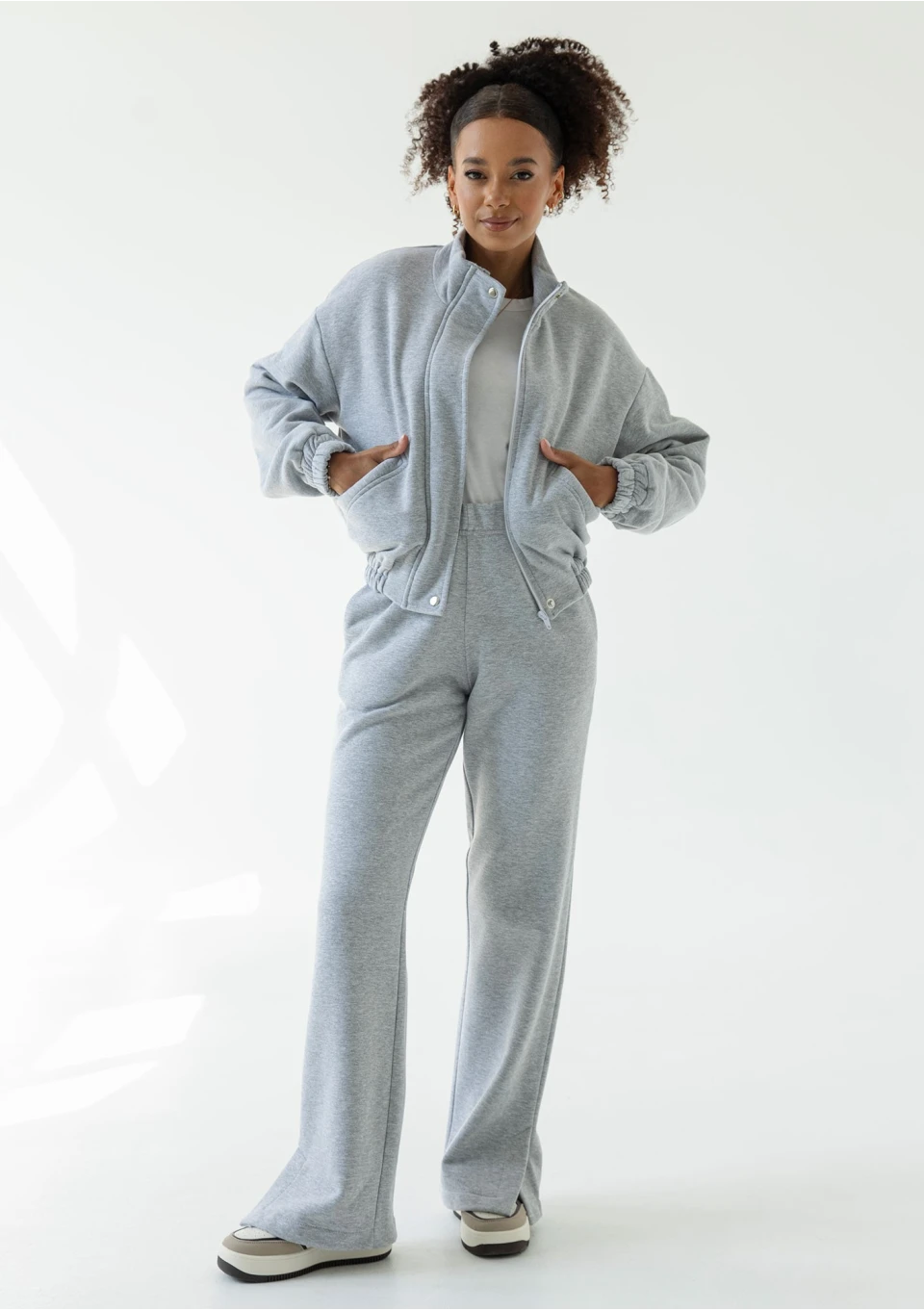Wygodna, rozpinana bluza bomberka, wyposażona w kieszenie. Uszyta z miękkiego materiału dresowego w melanżowym, szarym kolorze.